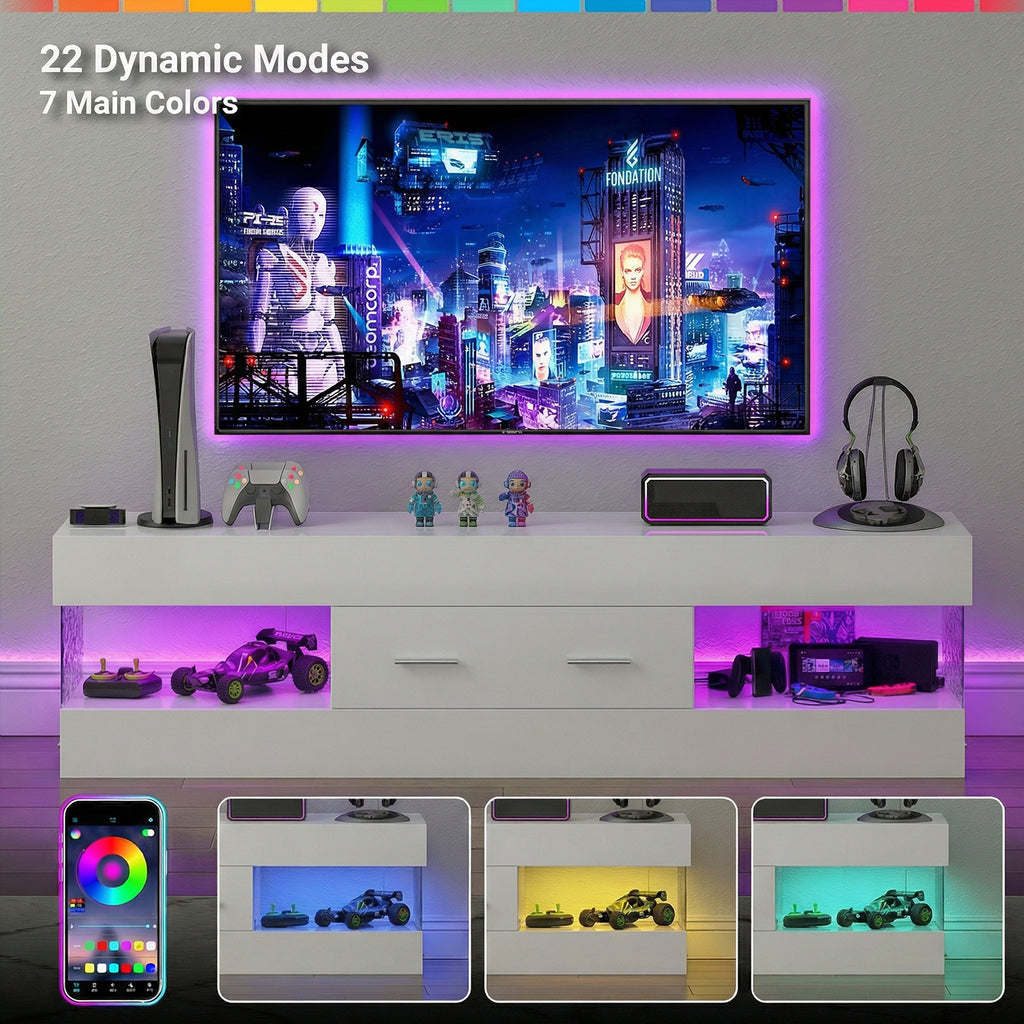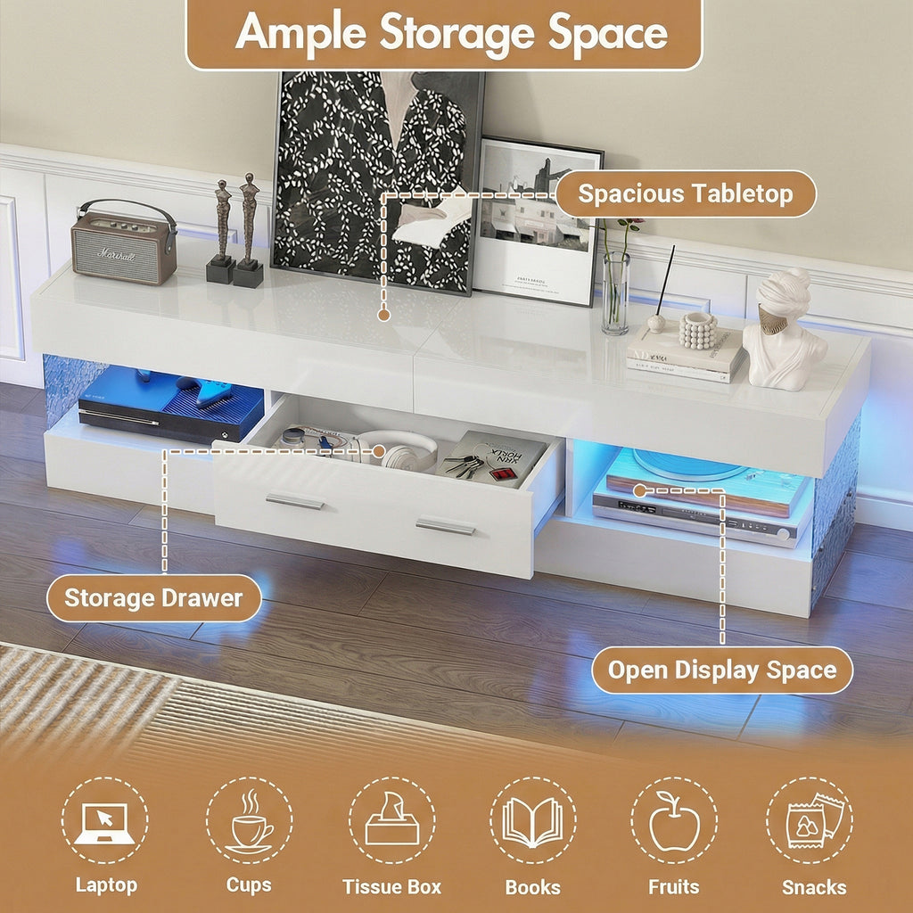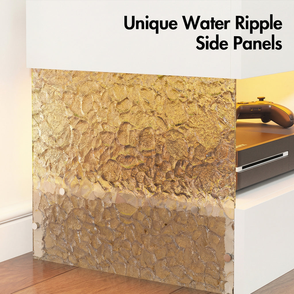 Sleek and Unique Design: Highlight the contemporary style, including glossy finishes, water corrugated side panels, and built-in LED lighting. Emphasize how the furniture fits modern living spaces, making it perfect for those looking to elevate home decor. The modern TV stand is perfect for TVs up to 65 inches.