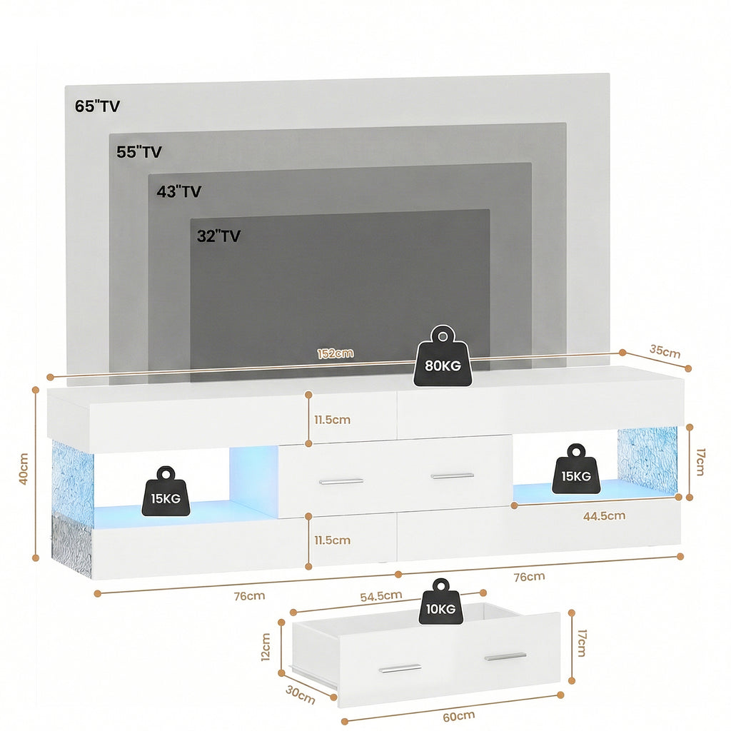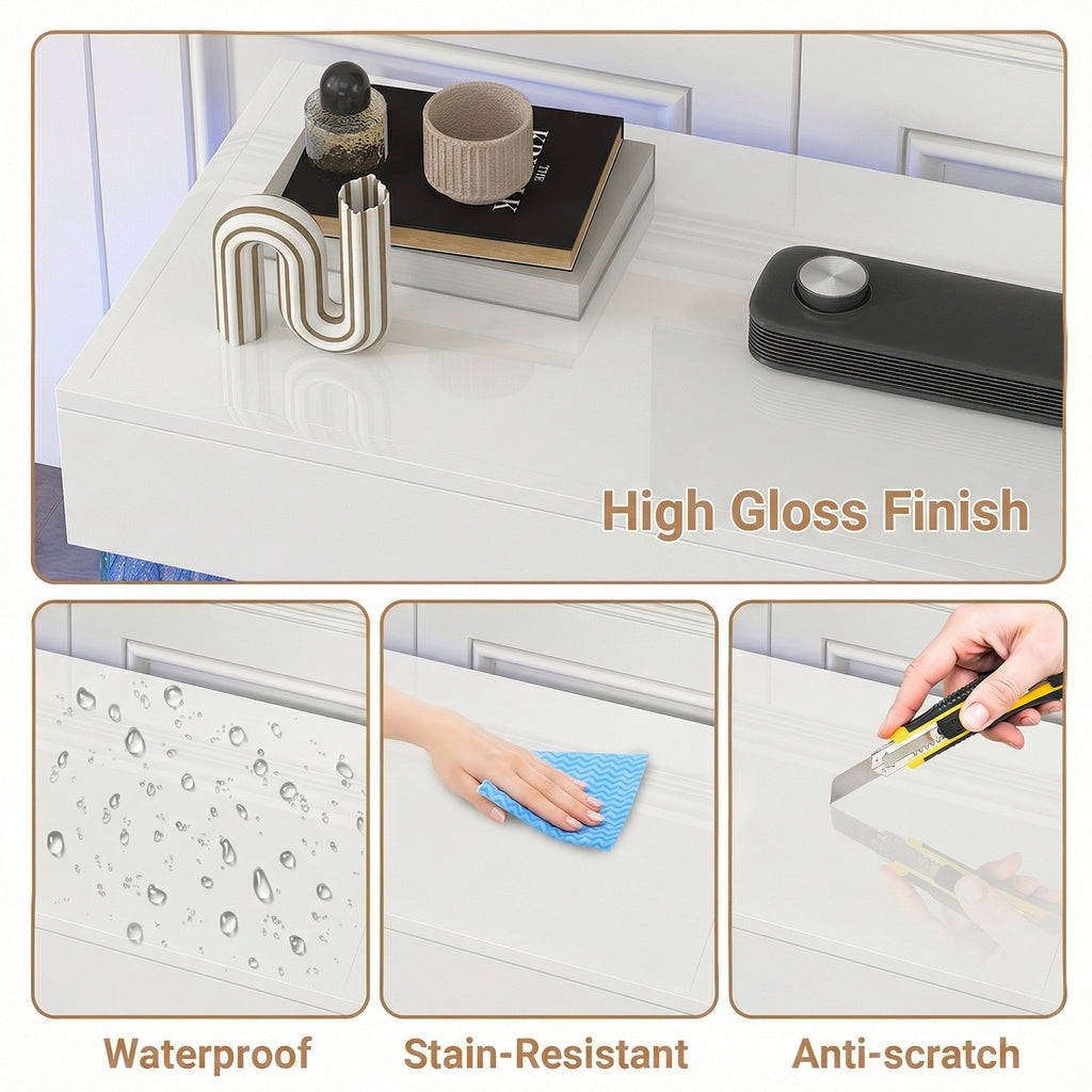 Stable and High-Quality: High-quality particle board ensures that the TV cabinet is strong and durable. The floor-standing structure ensures the stability of the table and is not easy to shake. The high-gloss finish makes the surface easy to clean, resisting stains and scratches, ensuring the furniture looks pristine for longer. This tv stand with shelves can withstand up to 80kg.