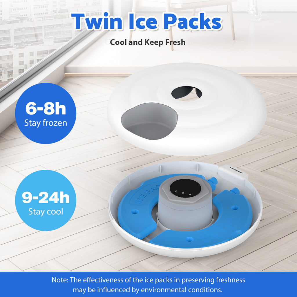 - Keep Food Cool and Fresh: Keep your pet’s wet food cool and fresh for hours with our cat wet food automatic feeder, equipped with two reusable ice packs to maintain a steady low temperature of 5-13°C for up to 8 hours. Designed to lock out dust and insects, this wet food automatic feeder preserves food quality, so every meal is safe, healthy, and delicious for your pet.