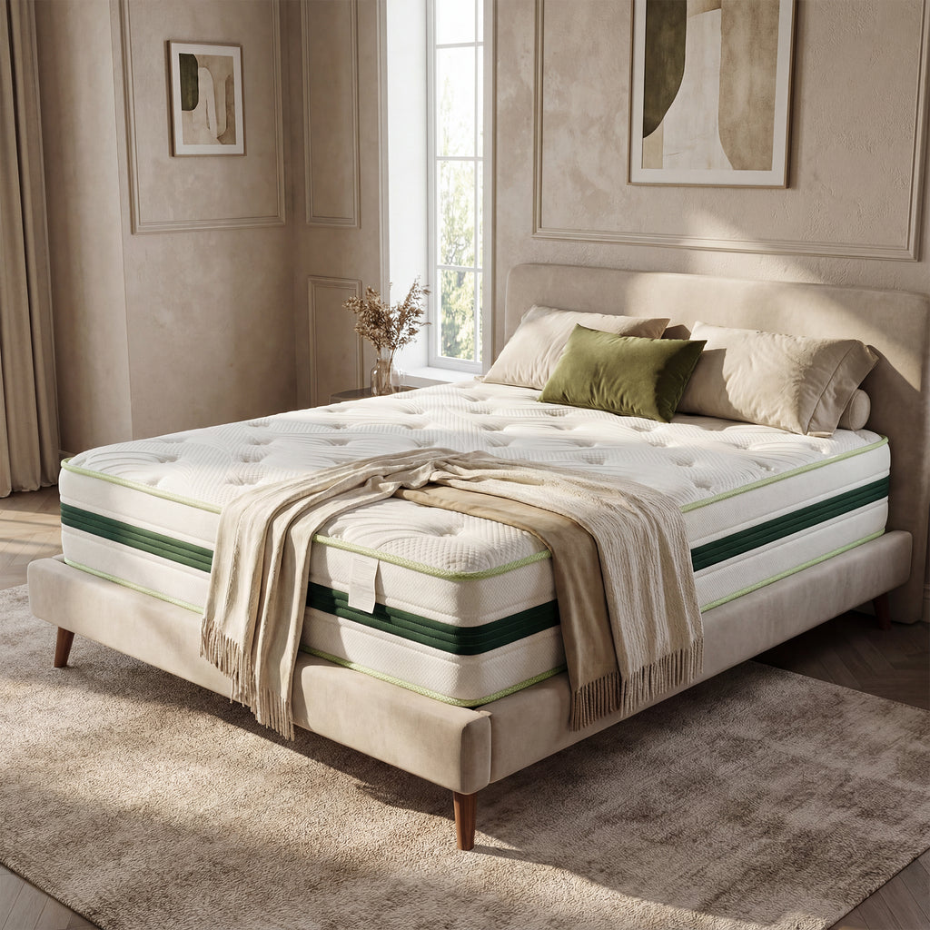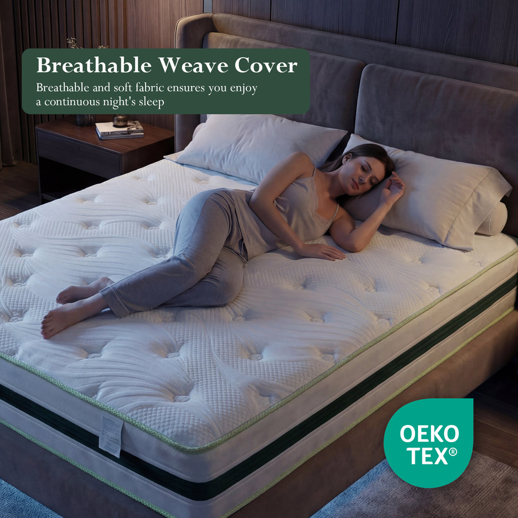 • Hybrid Luxury Mattress: Our hybrid design combines hundreds of individual pocket springsthat contour to your body’s shape with multiple layers of supportive memory foam. This ensures optimal spinal alignment and cradles your pressure points from head to toe, providing relief for back and side sleepers.