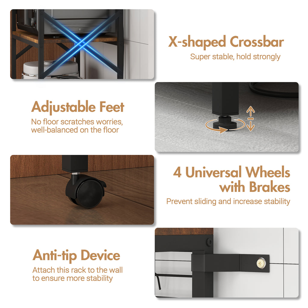 - Detailed Design: It adopts a sturdy metal frame and 2 X-shaped structures on the side to ensure long-term stability. The included anti-tip device can fix the bracket to the wall to ensure safety. The bottom features 4 lockable wheels and adjustable feet, which can be freely selected according to actual needs.