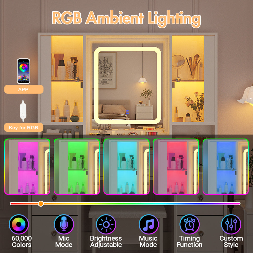 - RGB Lighting Cabinets: This dressing table features smart RGB LED light strips built into 2 acrylic display cabinets, controllable via button or app. With 60,000 colors, multiple lighting effects, dynamic modes, and music sync, you can easily adjust color, brightness, and effects to create your ideal ambiance.