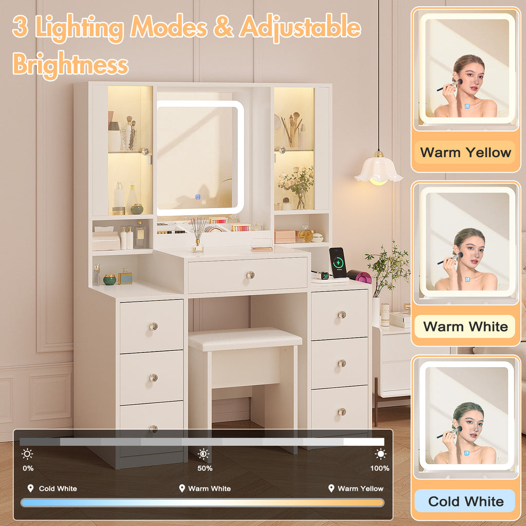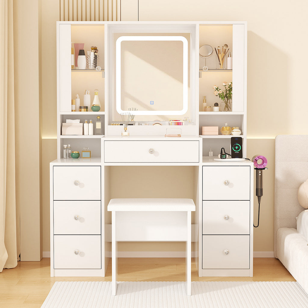 Mirror features a seamless LED light strip with adjustable brightness and three color tones—cool white, warm white and warm yellow—delivering soft, even illumination for flawless makeup from day to night. Two acrylic display cabinets are equipped with smart RGB LED strips, controllable by button or app, offering up to 60,000 colors, dynamic lighting effects and music sync to create personalized ambiance. Designed for organization, the vanity includes 7 drawers, 2 display cabinets, open shelves and side storage platform to neatly store makeup, skincare, jewelry and daily essentials. Built-in charging station keeps devices and styling tools powered, while hair dryer holder adds convenience. Finished in modern white with crystal handles and paired with a cushioned stool, it delivers comfort, elegance, and practicality.