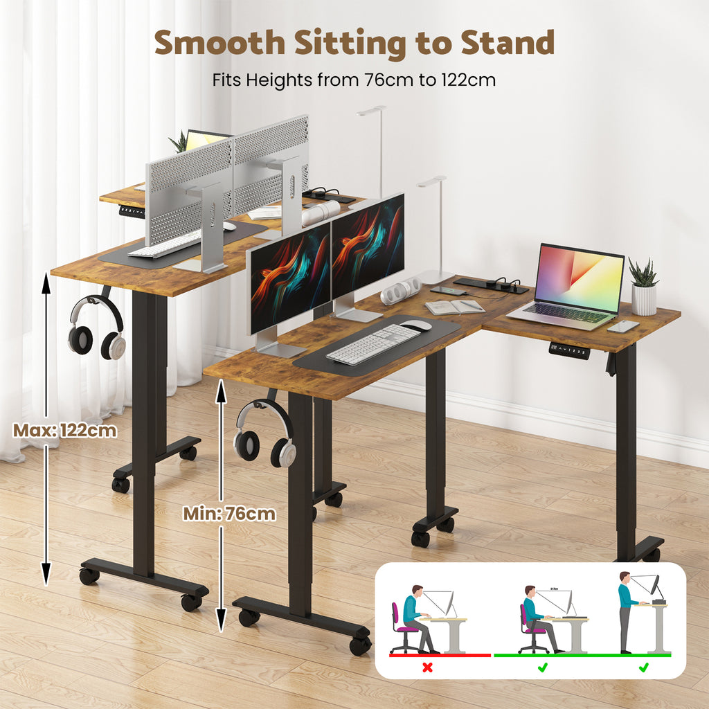 The versatile and ergonomic solution designed for the modern work environment. This desk features a smooth electric lifting system that quietly adjusts from 76 cm to 122 cm at 20 mm/s, allowing for effortless transitions between sitting and standing to combat sedentary fatigue. Customize your experience with the LED controller, which offers 3 memory presets, while the sub-50 dB operation and built-in obstacle detection ensure both quiet and safe use. Stay powered and organized with the integrated charging station for your devices and 2 convenient hooks for easy access to essentials. Built with industrial-grade steel and reinforced particleboard, it robustly supports 70 kg, making it ideal for a dual-monitor setup. The 90° L-shaped design fits perfectly into any corner, maximizing your space for multitasking, and with its 6 casters (including brakes) and easy-to-clean surface, it offers unparalleled mobility and requires zero maintenance, allowing you to reconfigure your space with ease.
