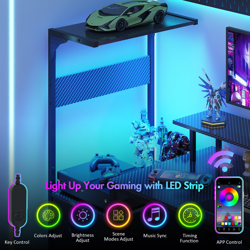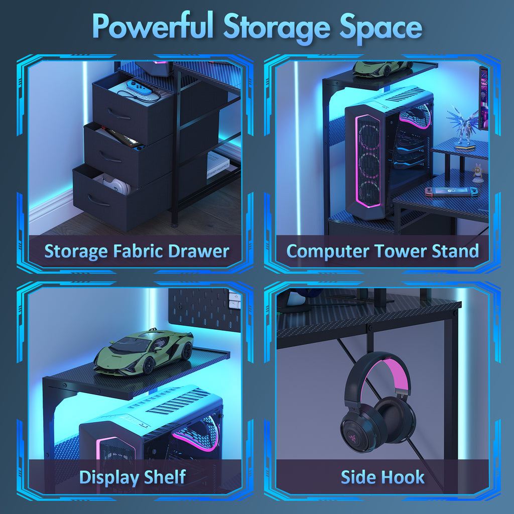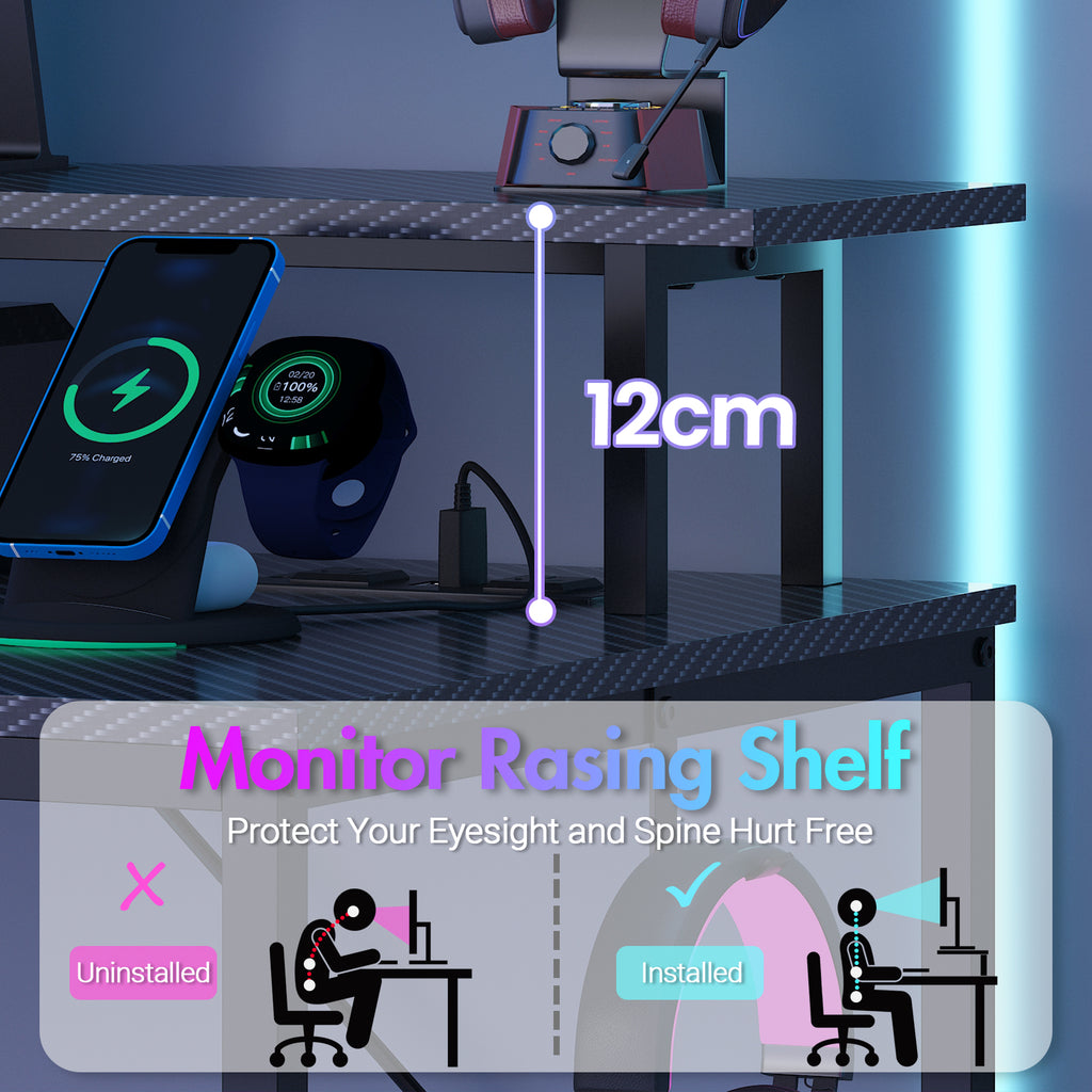 The integrated LED lights add an immersive ambiance, while the built-in power outlets, USB ports ensure your devices are always charged and ready. Perfect for gamers, workers, and professionals, this desk features built-in storage shelves, blending practicality with sleek design.
