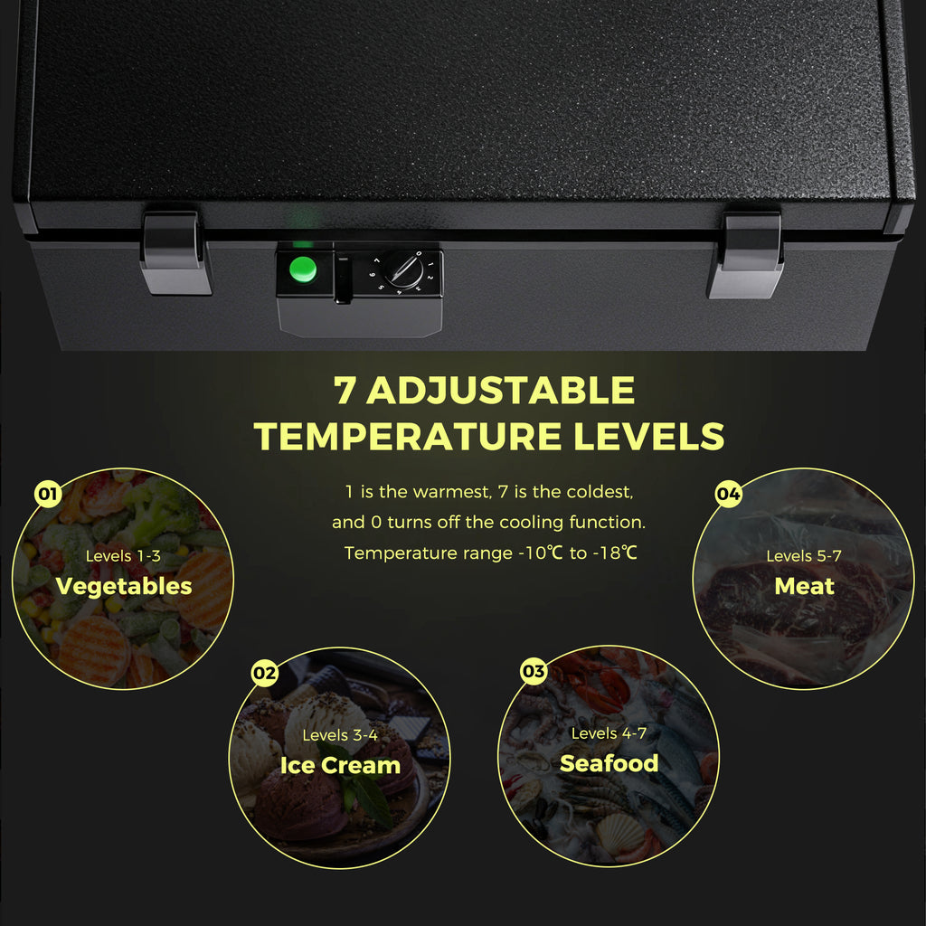 Store your frozen goods efficiently with this 50L chest freezer. Featuring mechanical 7-level temperature control, it allows temperatures from -10°C to -18°C, with a 0-level option to turn off cooling, giving you flexible control over your freezer’s operation.