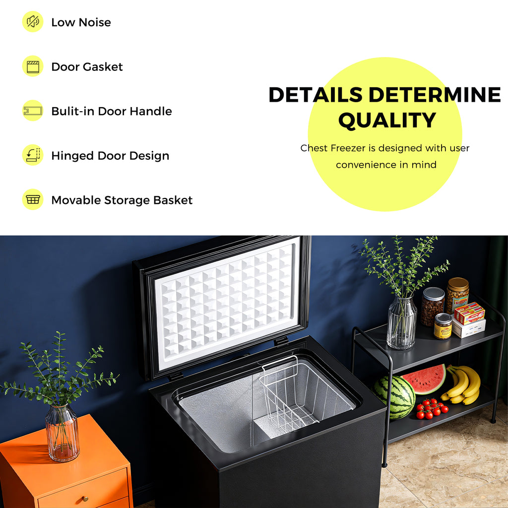 50L Spacious Interior with Removable Wire Basket: With a 50L capacity and included removable wire basket, this compact chest freezer allows organized storage of frozen goods. Store meat, vegetables, seafood, ice packs, and beverages efficiently while keeping items accessible. Suitable for home, office, bar, or small commercial use.