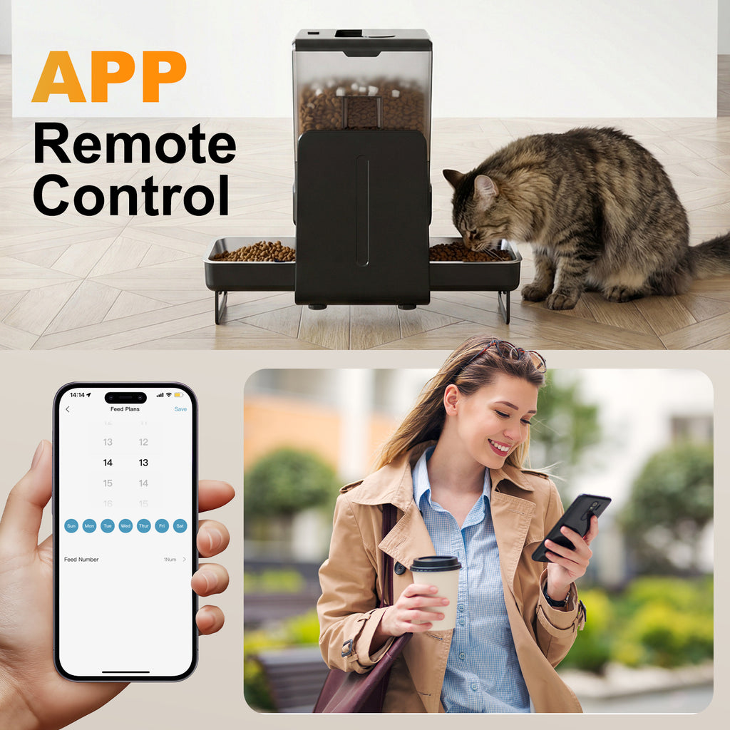 • Smart APP Control: Auto cat feeder supports both 5GHz and 2.4GHz network connections. With the APP, you can schedule up to 10 meals per day with 1-12 portions each, feed your pet remotely, or give them a surprise treat anytime. Whether you’re at work or traveling, this smart automatic cat feeder ensures your pet is fed on schedule.