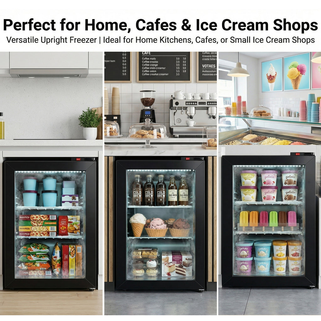 - Fixed Glass Door & Versatile Use: The non-reversible glass door showcases your frozen items while keeping them protected. This upright freezer is ideal for home, restaurant, bar, cafe, or small shop, combining convenience, visibility, and reliable freezing performance in a compact 60L size.