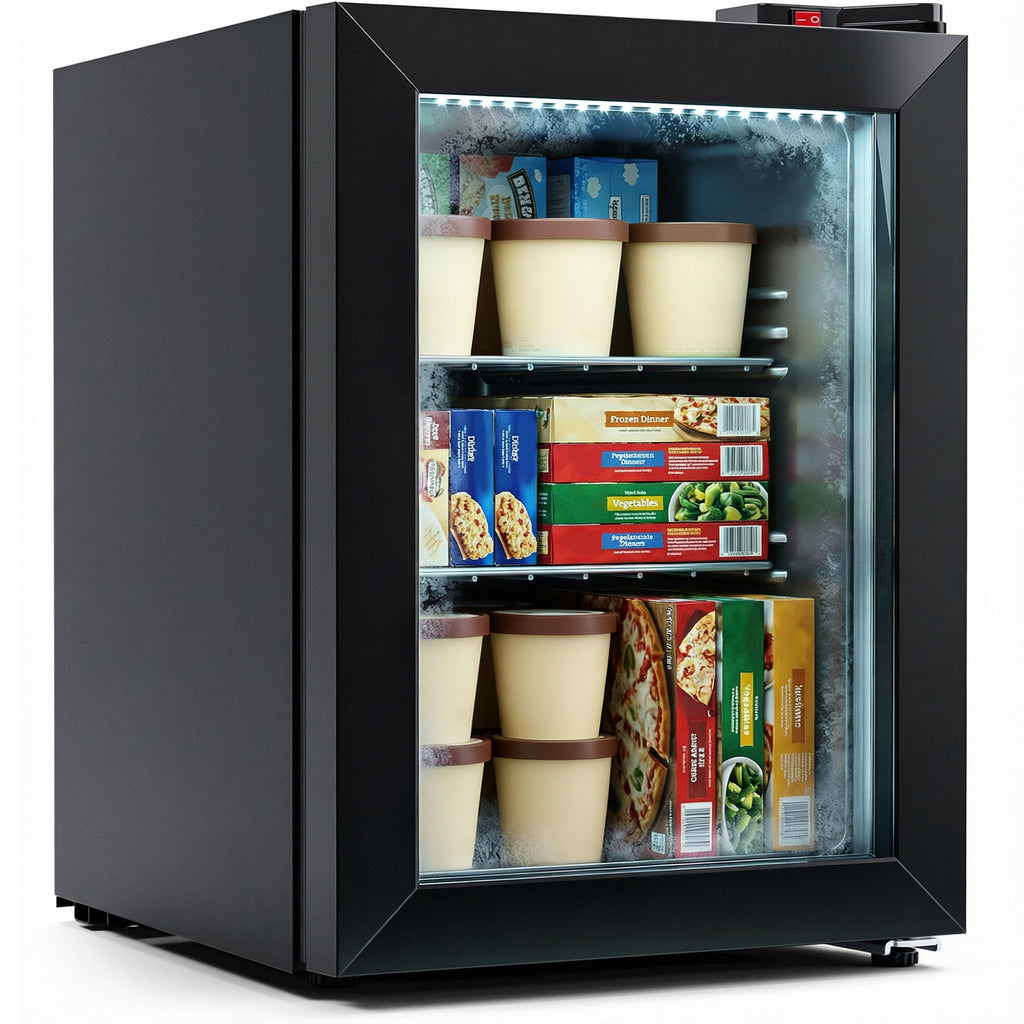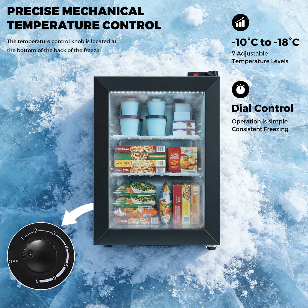 - Precise Mechanical Temperature Control – 7 Levels: This 60L glass door upright freezer features 7-level mechanical temperature control for accurate cooling. Temperature ranges from -18°C (level 7) to -10°C (level 1), ensuring optimal storage for meat, seafood, frozen food, ice cream, and beverages. Perfect for home kitchens, restaurants, bars, and shops.