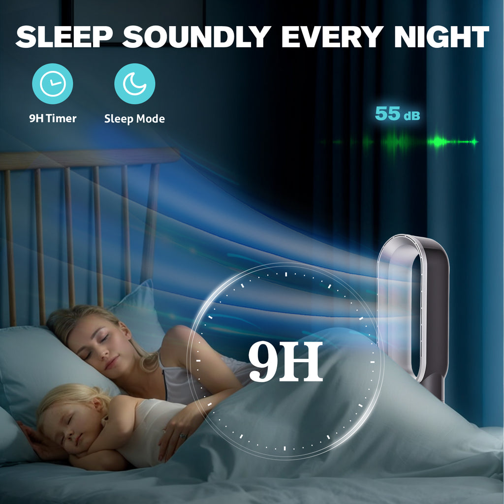 Advwin Bladeless Tower Fan provides a safe, quiet, and efficient cooling solution for your home, bedroom, living room, or office. Designed with a bladeless structure, it eliminates the risk of accidents while delivering smooth and strong airflow. The fan features 8 adjustable speeds, 80° oscillation, and a 9-hour timer, allowing you to customize the airflow for optimal comfort. With both remote and touch control, operation is convenient from anywhere in the room. Ideal for households with babies,children and pets, it ensures a safe and peaceful environment while keeping you cool.
