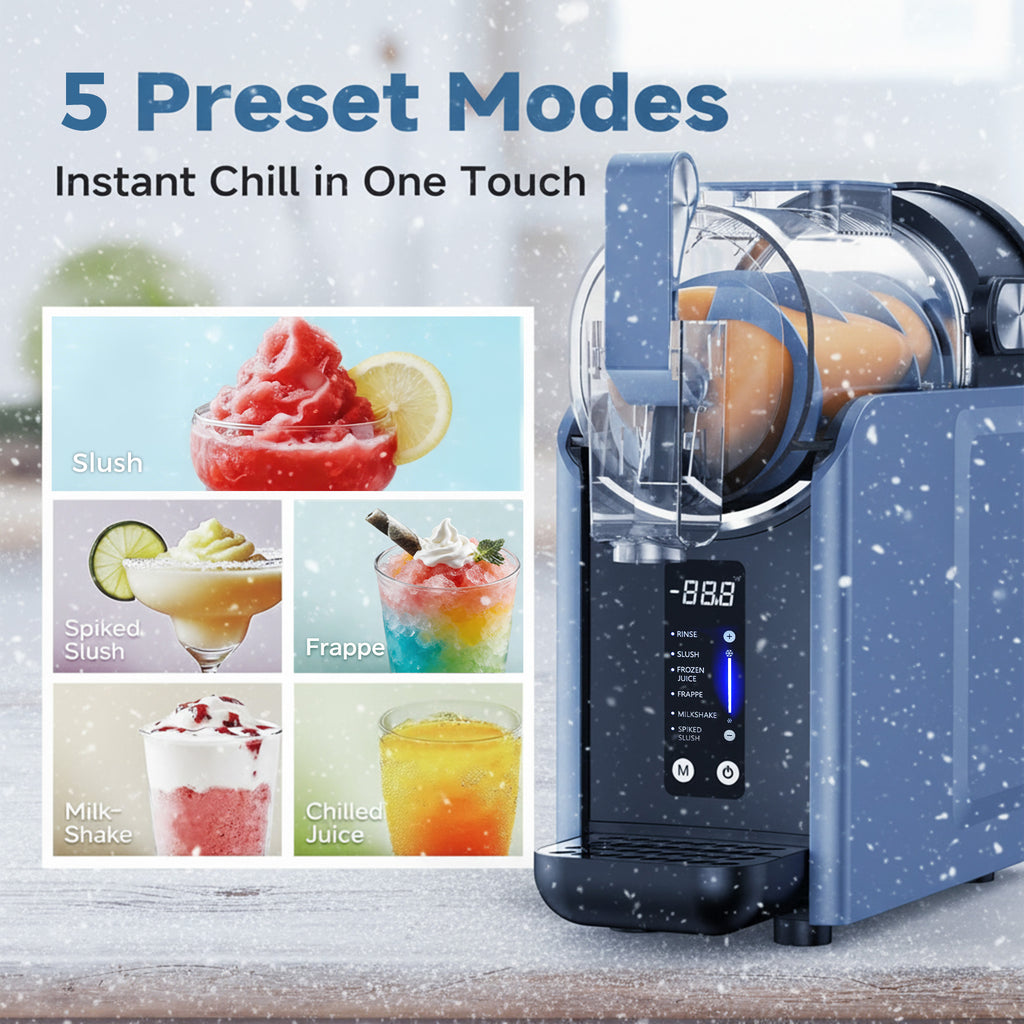 - 5-in-1 Drink Modes: This Slushie Machine / Frozen Drink Maker includes 5 preset programs – Slush, Chilled Juice, Frappe, Milkshake & Spiked Slush – ideal for making iced coffee, smoothies, cocktails, soft ice cream and frozen desserts.