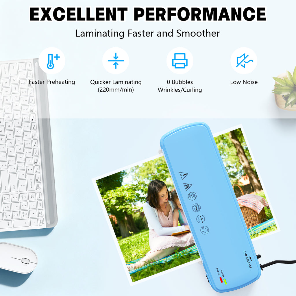 Quick Preheating and Lamination: This laminating machine can be ready in just 3-5 minutes, with a laminating speed of 220mm/min. It can produce an A4 paper within 60 seconds without wrinkling, improving your work efficiency. Ultra low noise, suitable for homes and offices.