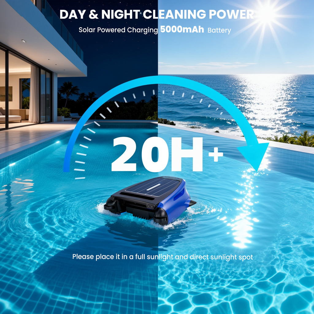 Solar Powerful and Adapter Charging: Our pool vacuum cleaner is equipped with solar panels that can automatically charge during the day. It also includes a power adapter, 2-3 hours of fast charging, and can provide up to 20 hours of operation time, ensuring uninterrupted automatic continuous cleaning of the water surface around the clock.