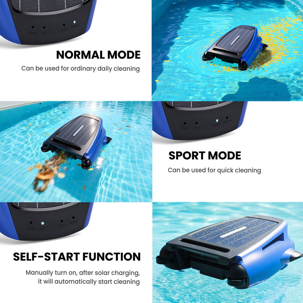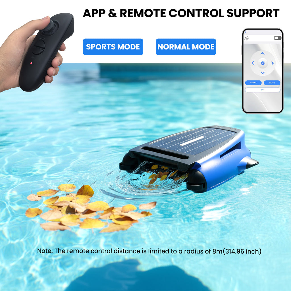 2 Cleaning Modes: The solar powered pool skimmer has two speed modes. Normal mode is used for daily cleaning, while sport mode is used for quick cleaning to meet your different cleaning needs. The pool vacuum cleaner can be remotely controlled through an app or remote control (The remote control distance is limited to 8 m).
