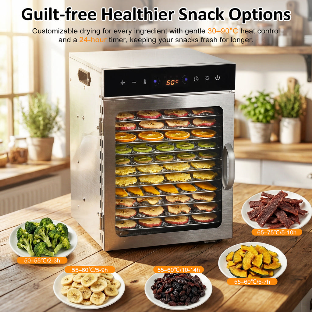 Make your own nutritious, preservative-free snacks with this 12-tier food dehydrator. With an 800W motor and 360° hot air circulation, it ensures even drying for fruits, vegetables, jerky, and herbs. The food-grade stainless steel trays are spacious enough for large batches, while the adjustable timer and temperature (30–90°C) give you precise control. Built to last with durable stainless steel, it’s easy to clean and operate. Perfect for making fruit chips, veggie crisps, and healthy pet treats. Enjoy homemade snacks all year round!
