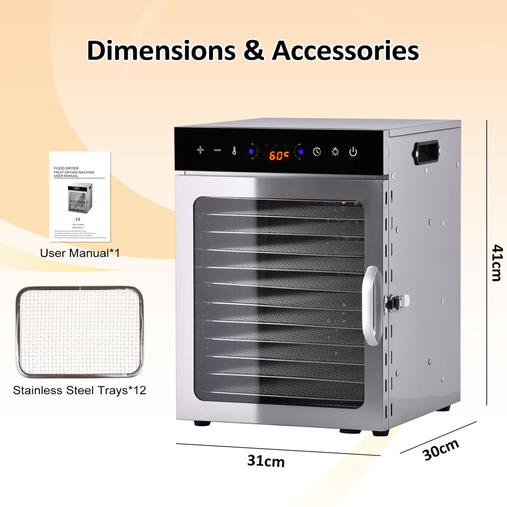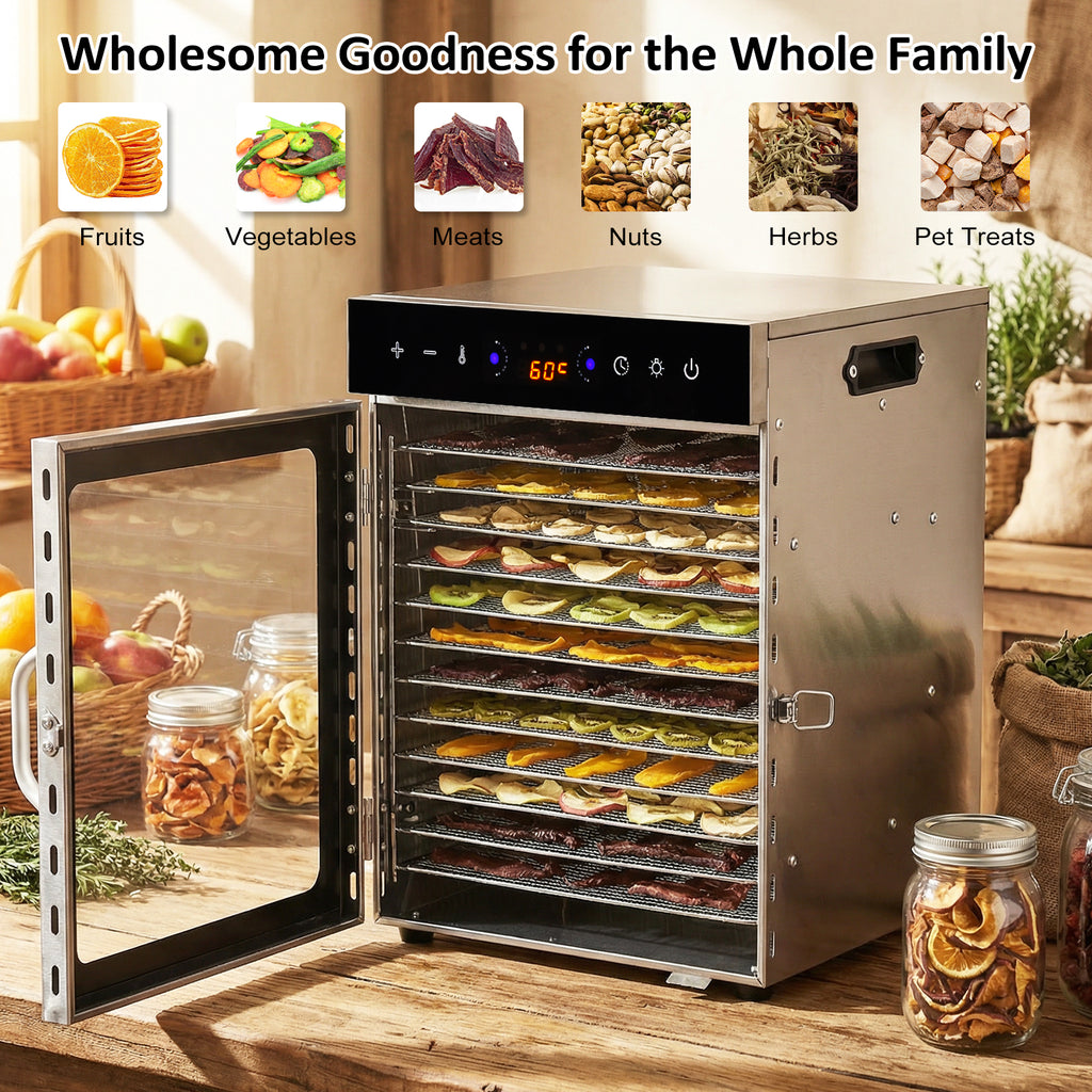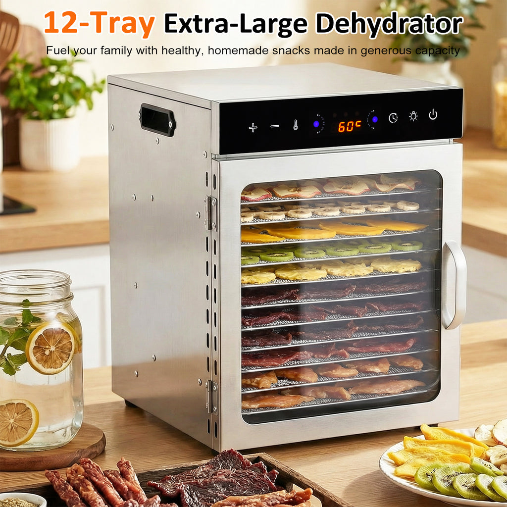 - 12-Tier High-Efficiency Food Dehydrator: Experience ultimate dehydration with our 12-tier Healthy food dehydrator. Equipped with an 800W motor and 360° Even Circulating Hot Air System, it ensures uniform drying for fruits, vegetables, herbs, and meat jerky. Each tier features food-grade stainless steel trays with 2.5cm spacing, allowing large-capacity batches for home or commercial use. Perfect for healthy snacks, fruit rolls, dried vegetables, beef jerky, and pet treats.