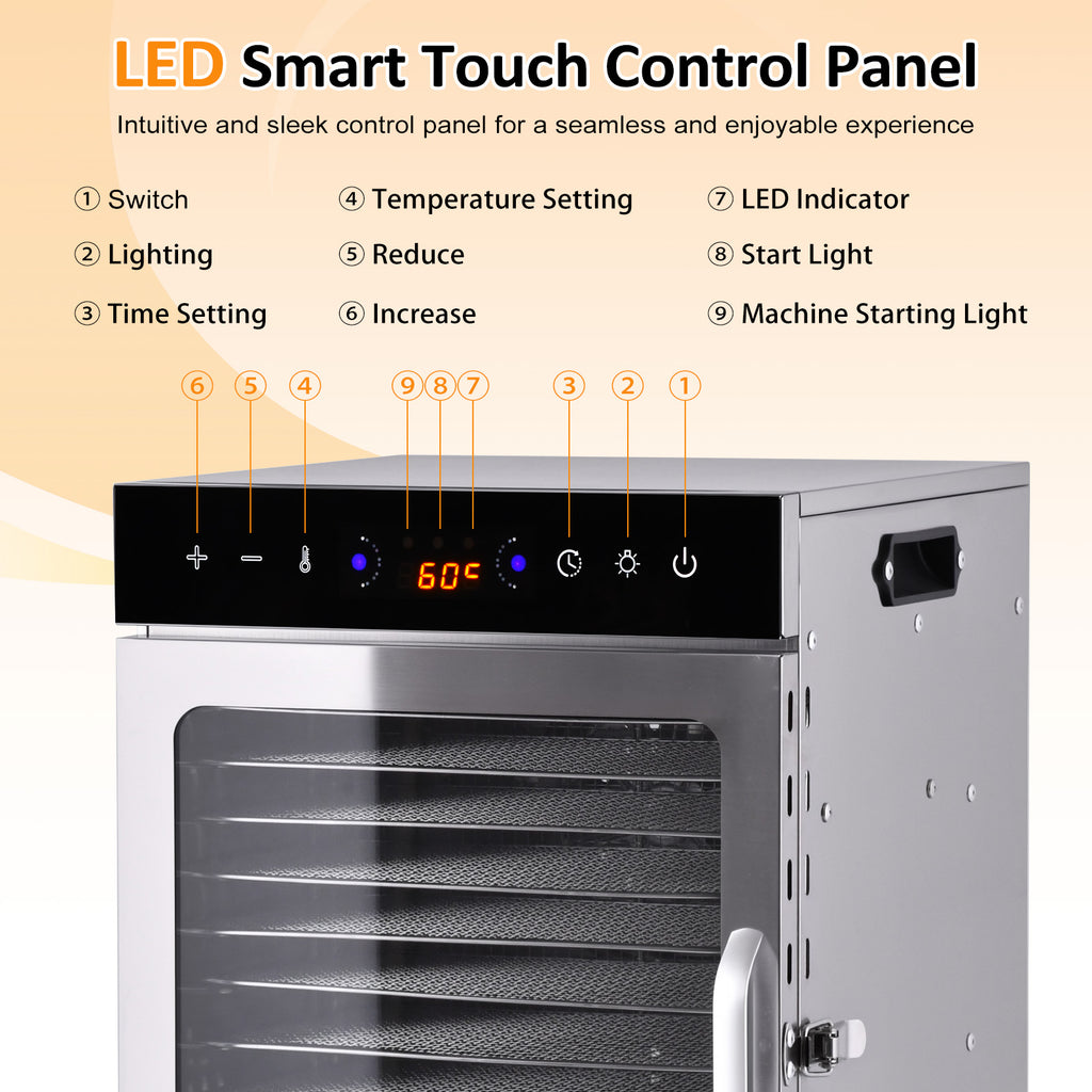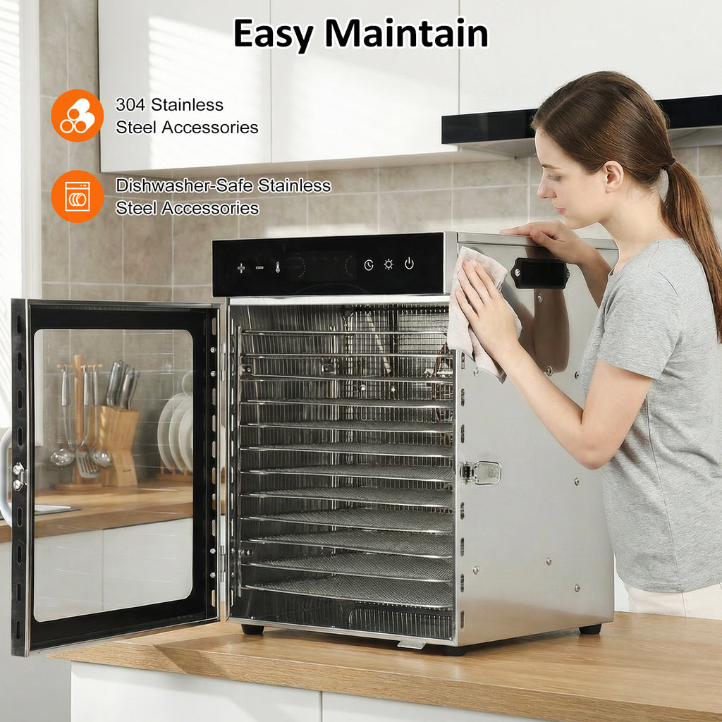 - Easy-to-Clean & User-Friendly Design: Enjoy hassle-free cleaning with dishwasher-safe stainless steel trays and a smooth, wipe-clean body on this large food dehydrator. The intuitive LCD touch panel and transparent observation window allow you to monitor drying progress without opening the lid. Designed for effortless operation and daily maintenance.