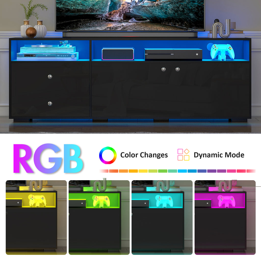 - Sleek Modern Design: The TV stand features clean lines, a black finish, and high-gloss surfaces on drawers and doors, blending effortlessly into modern home decor. Beyond a TV cabinet, the cabinet can also be a display shelf for your home office or a storage cabinet in the bedroom. Its compact size and functional design adapt seamlessly to different rooms.