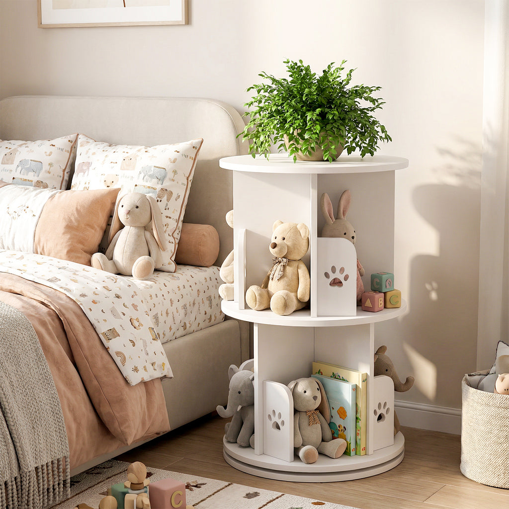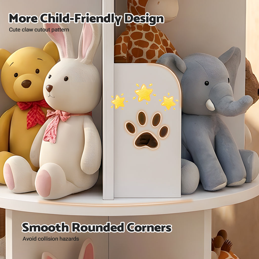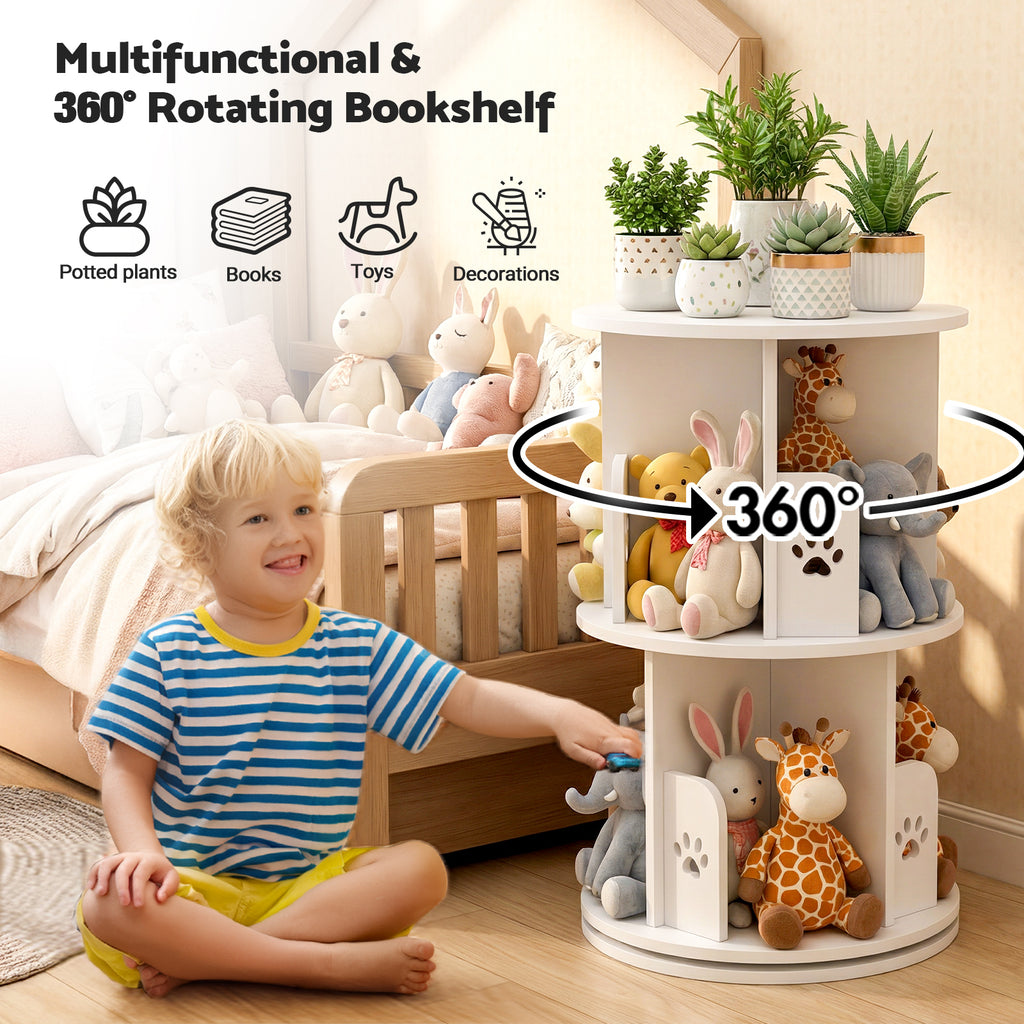 Advwin enchanting bookcase features charming dog paw silhouette panels that delight young readers while organizing their favorite books and toys. Designed at the perfect height for little ones, it empowers toddlers and preschoolers to independently choose and return items, fostering both a love for reading and good organizational habits. 360-degree silky rotation allows you to easily access all books from any angle. Each layer is set with 4 independent units, which can stack various books, toys and exhibits. It is the perfect solution for changing living space and flexible use of space.