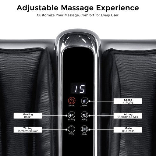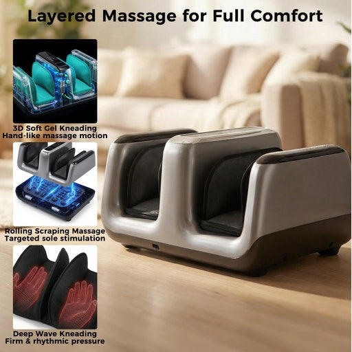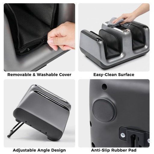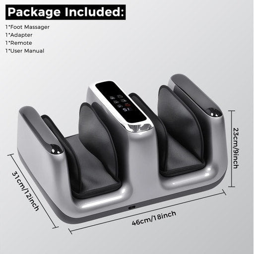 Equipped with deep kneading rollers, three-stage air compression, and optional heating, this Foot Massager targets the soles, arches, heels, calves, and hands. It offers multiple massage modes and intensity levels, simulating techniques used by therapists, including kneading, rolling, squeezing, and wave-style massage. The removable, washable fabric cover and skin-friendly mesh interior ensure comfort and hygiene. With quiet operation, an adjustable support frame, LCD display, and wireless remote control, this Foot Massager is ideal for daily relaxation, relieving soreness, improving circulation, and reducing muscle tension after long workdays or standing periods. Suitable for EU shoe sizes 35–46, it also supports calf and hand massage, making it a versatile wellness device for the whole body.