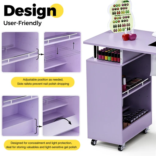 - Ample Storage Solutions: Featuring a drawer, cabinet, open shelf, and hidden flip-top compartment for UV-sensitive gel polishes, this manicure table offers plenty of organized storage. The adjustable shelf includes a metal guardrail to prevent items from falling, and 4 plastic dividers can be trimmed to keep drawers neat.