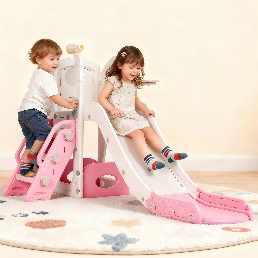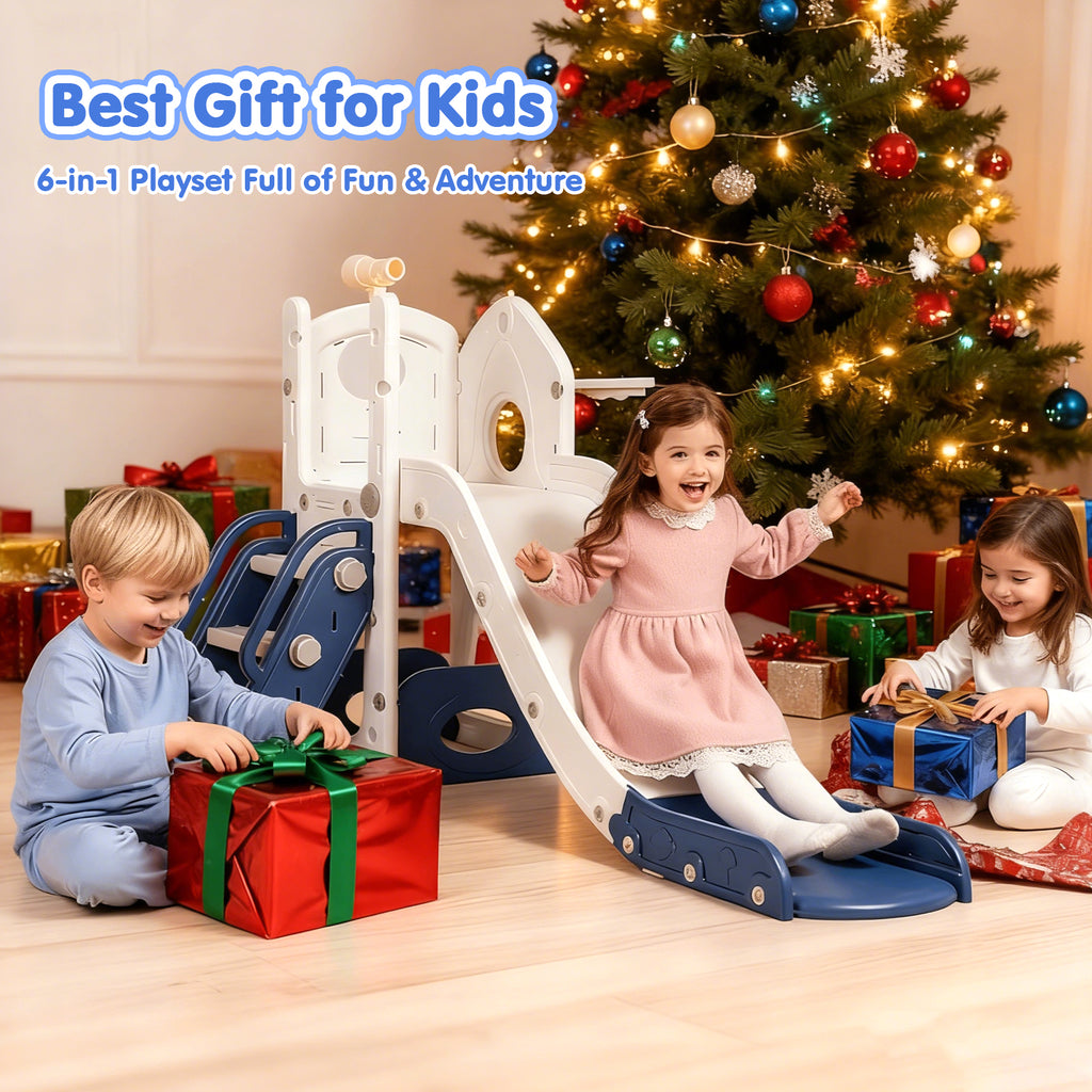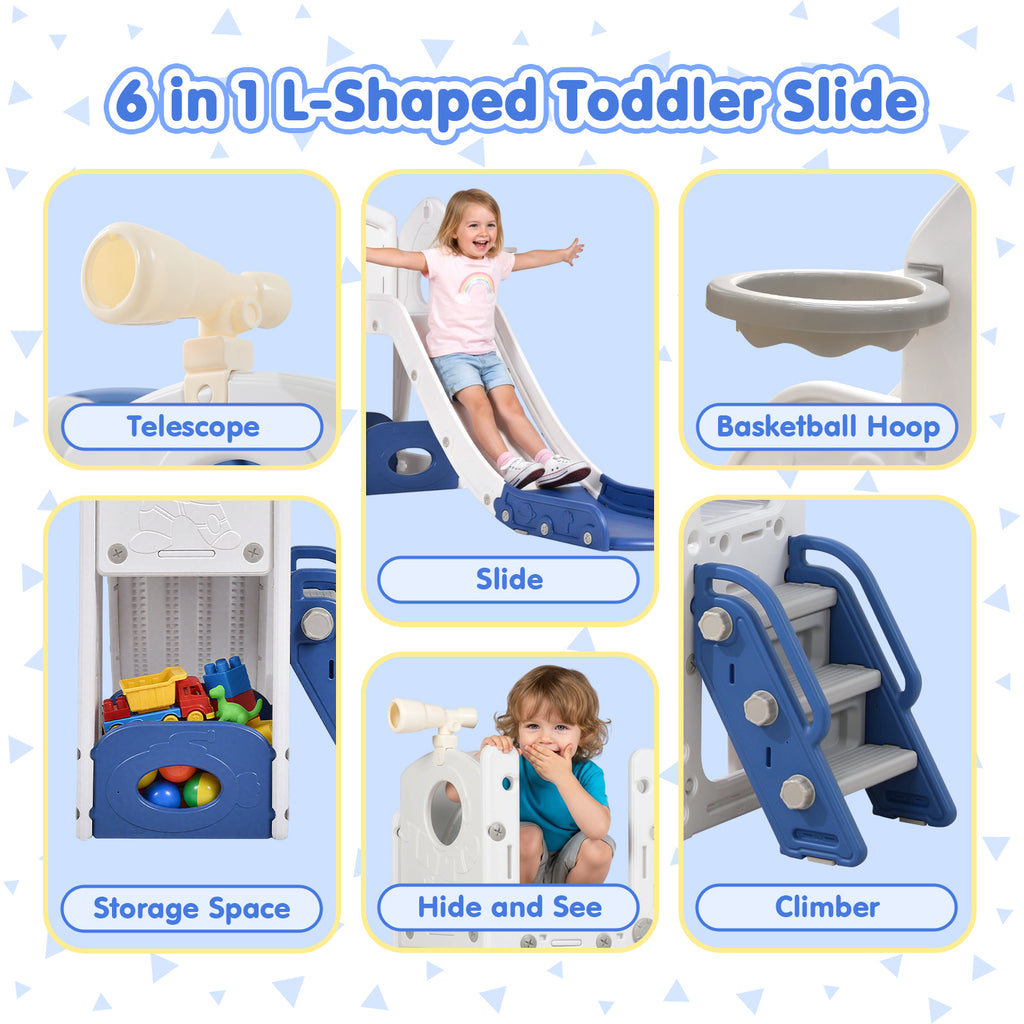 - 6-in-1 Toddler Wonderland: Let your toddler step into a magical world, guided by a playful mentor with a climber, slide, storage space, a basketball area, a play telescope, and hide-and-seek holes. It’s not just a toddler slide; it’s a charismatic guide to a realm of fun and skill development.