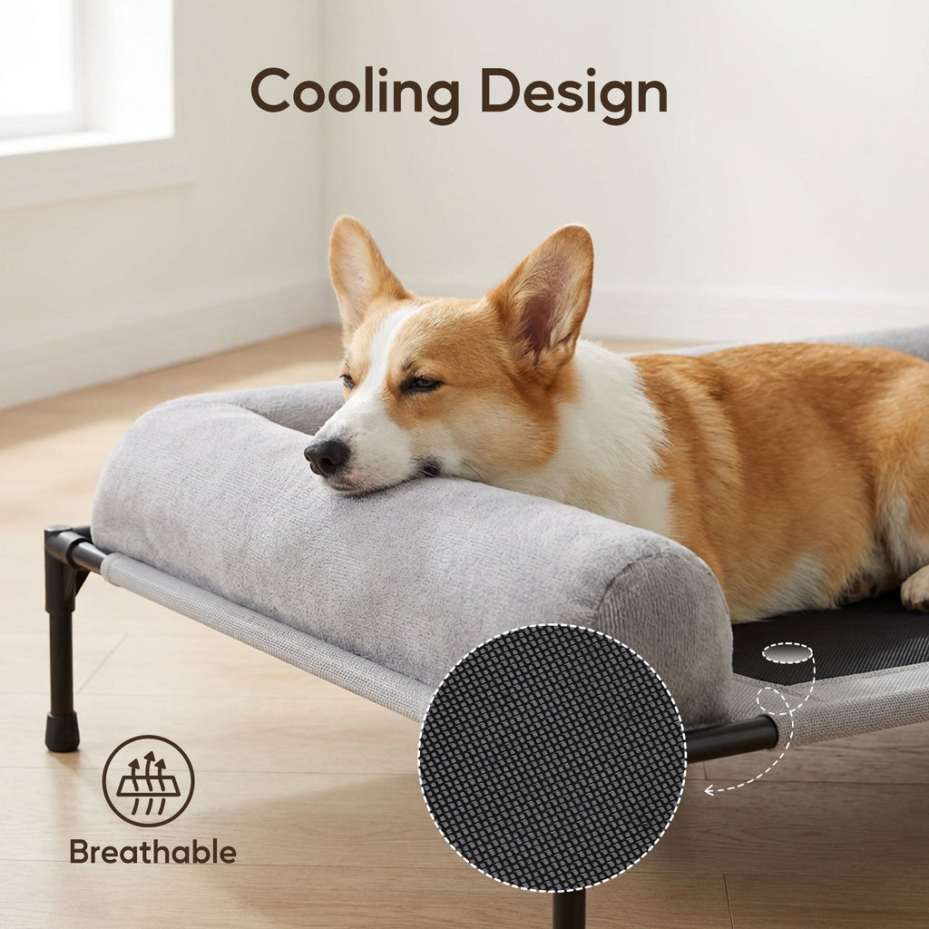 - Cooling and Comfortable: Cooling Elevated Dog Bed crafted of mesh fabric in the center, allows air to flow, keeping them cool while they relax in the heat. The raised breathable mesh cot works great indoors and outside. Keep your pup dry and comfortable when they are playing or sleeping outside.