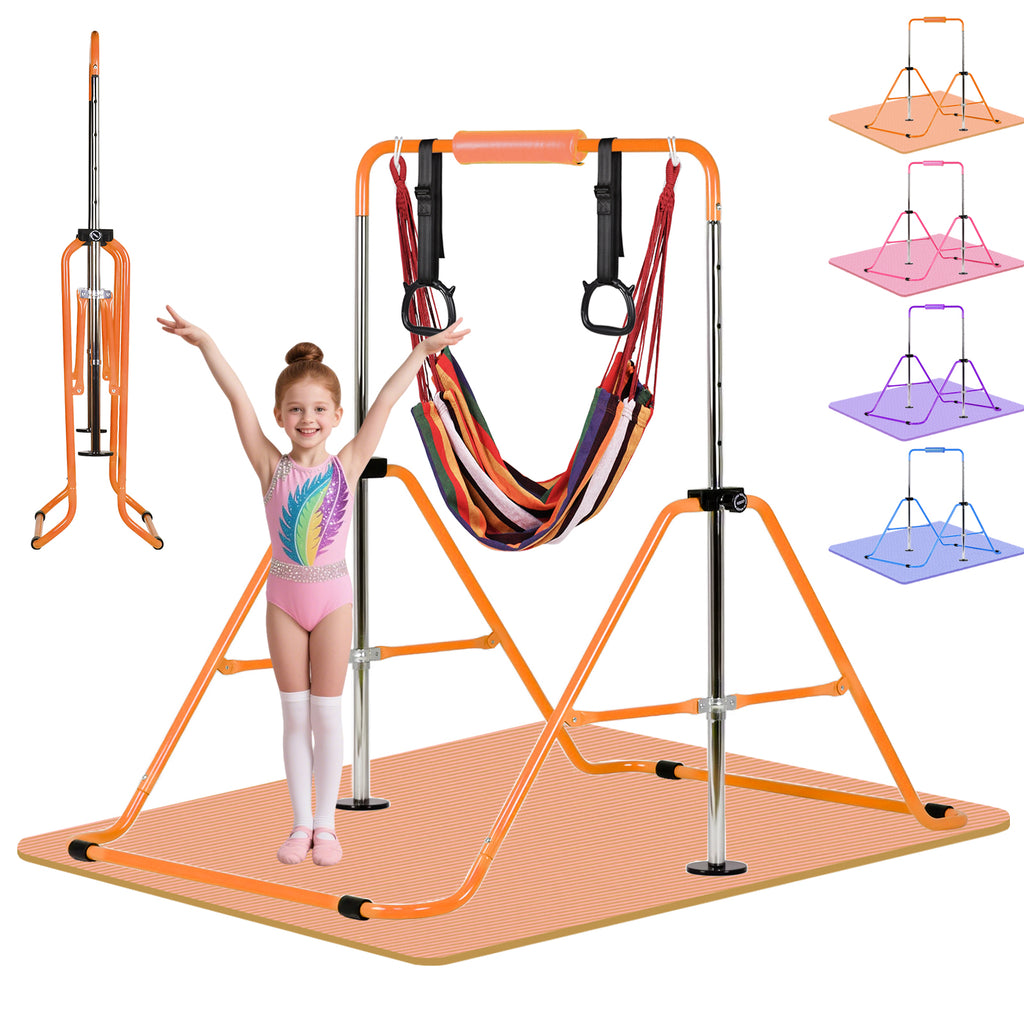 - Multi-Functional Setup: A versatile training set that combines a sturdy gymnastics bar with a fun detachable swing. Kids can practice balance, coordination, and strength—right at home. Includes two versatile rings and 120×183×1cm gymnastics mat to transform the gymnastics bar into a pull-up or swinging station, turning any backyard or playroom into a fun, active zone.