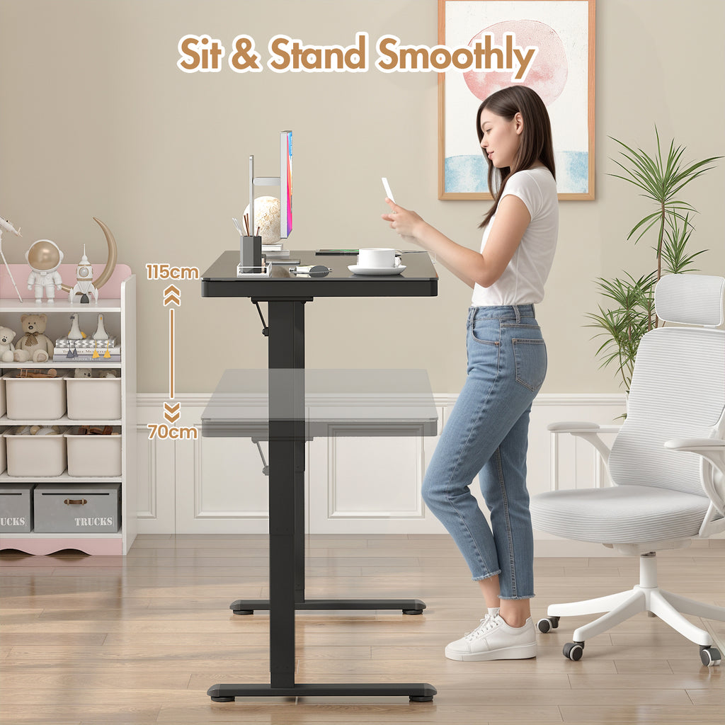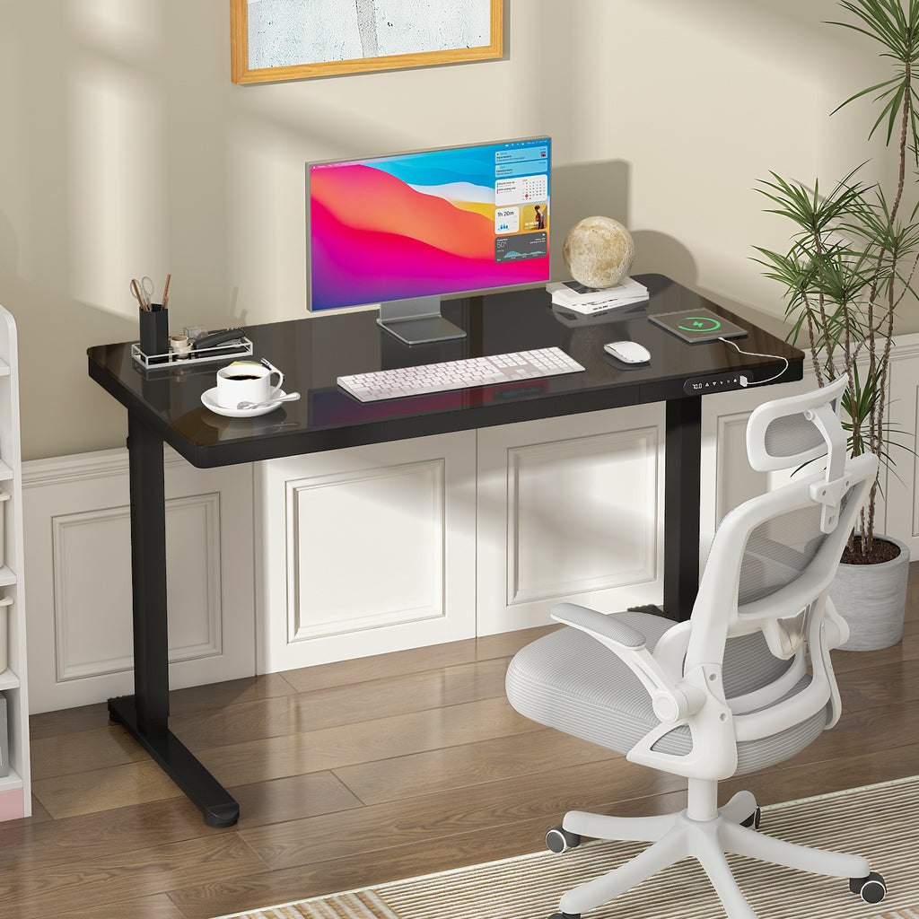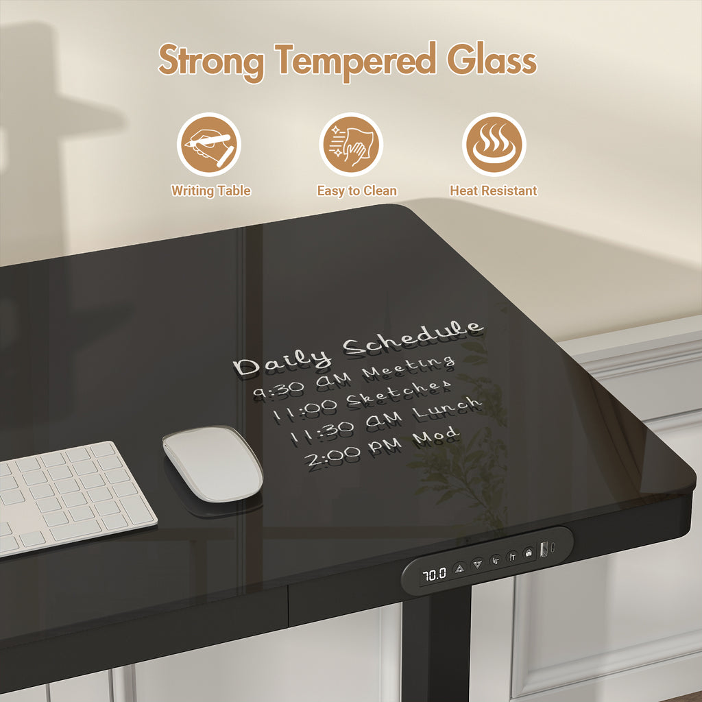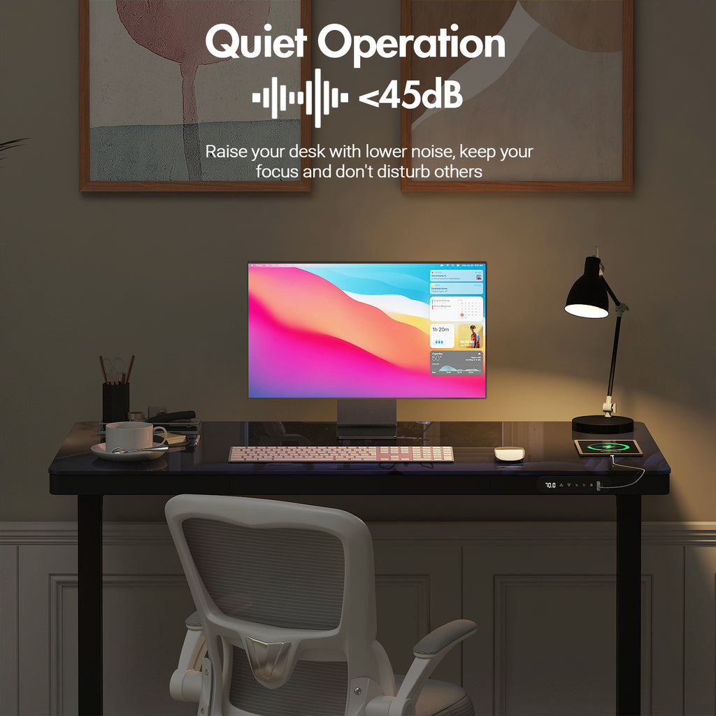 The standing desk features a one-piece desktop design with glass materia, the whole desktop is more solid, it is easier to clean. Designed with a quiet motor (<45dB) and a safety anti-collision system, this desk ensures a smooth and safe height adjustment process. It can support up to 70kg of weight.