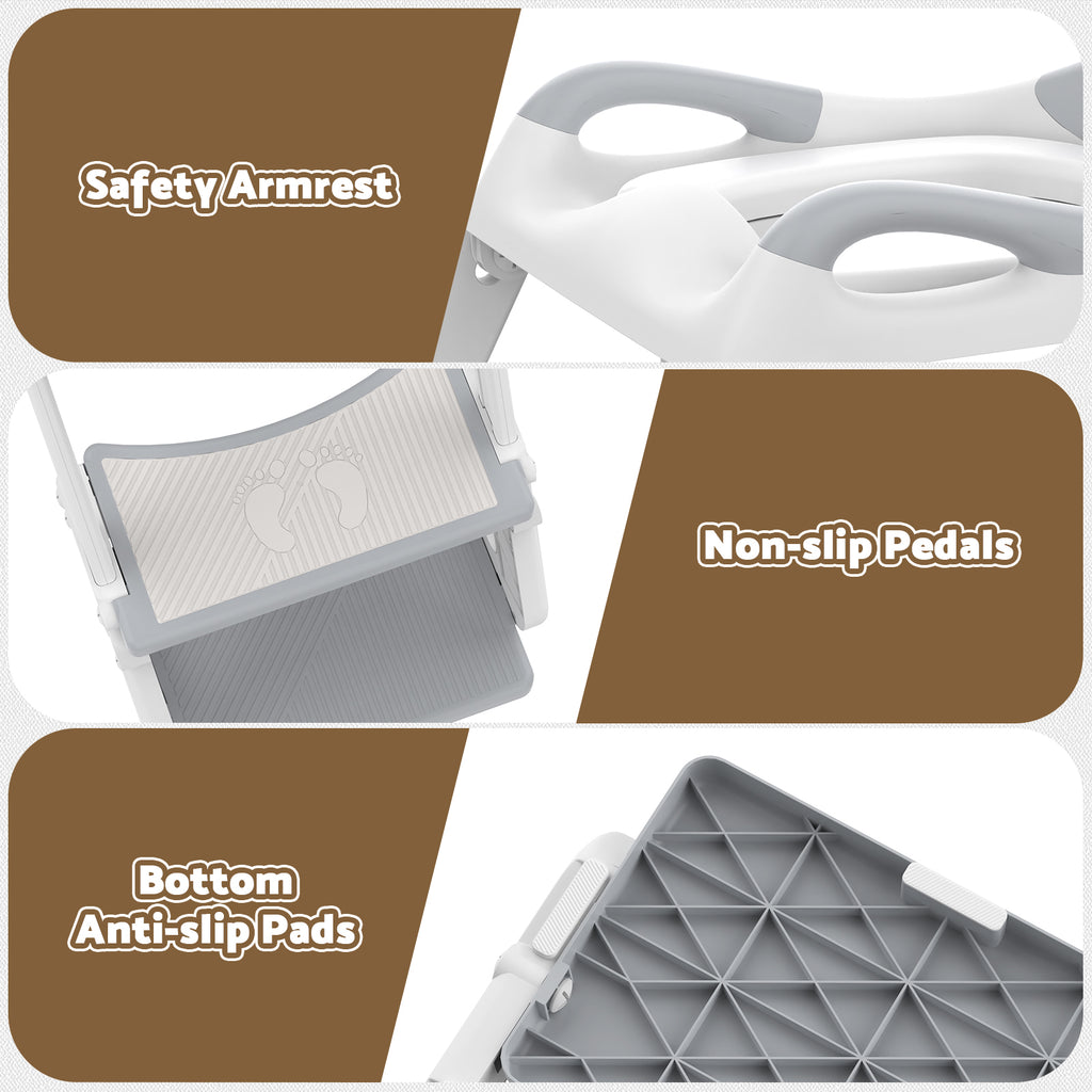 - Stable & Safe Design: Designed with a triangular frame, the 2-in-1 potty training toilet offers stability. Equipped with non-slip pads on the base and seat, it stays firmly in place. Non-slip ladder steps and ergonomic handles ensure the child climbs safely during potty training.