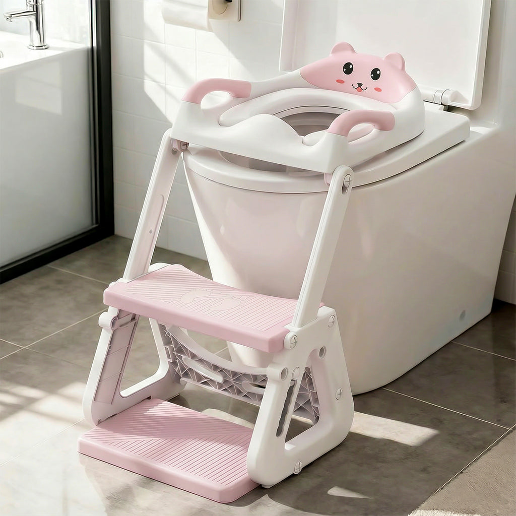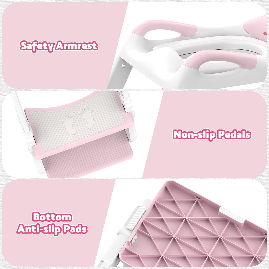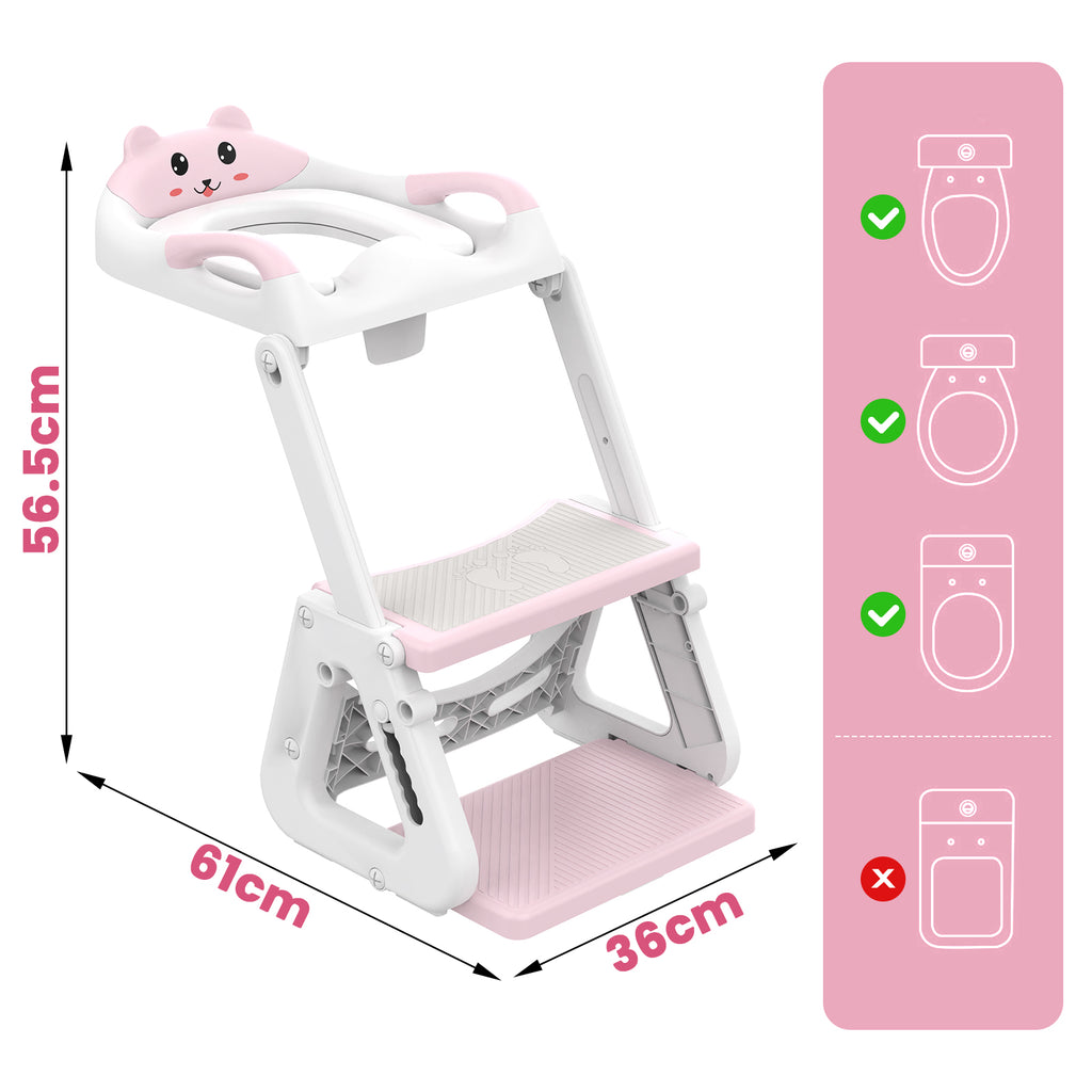 Boasting 7 adjustable seat heights and 2 adjustable footrest heights, it fits most standard toilets (not square ones). With a stable triangular frame, non-slip pads, ergonomic handles, plus a cute cartoon look, encouraging kids to use potty training seat with excitement.