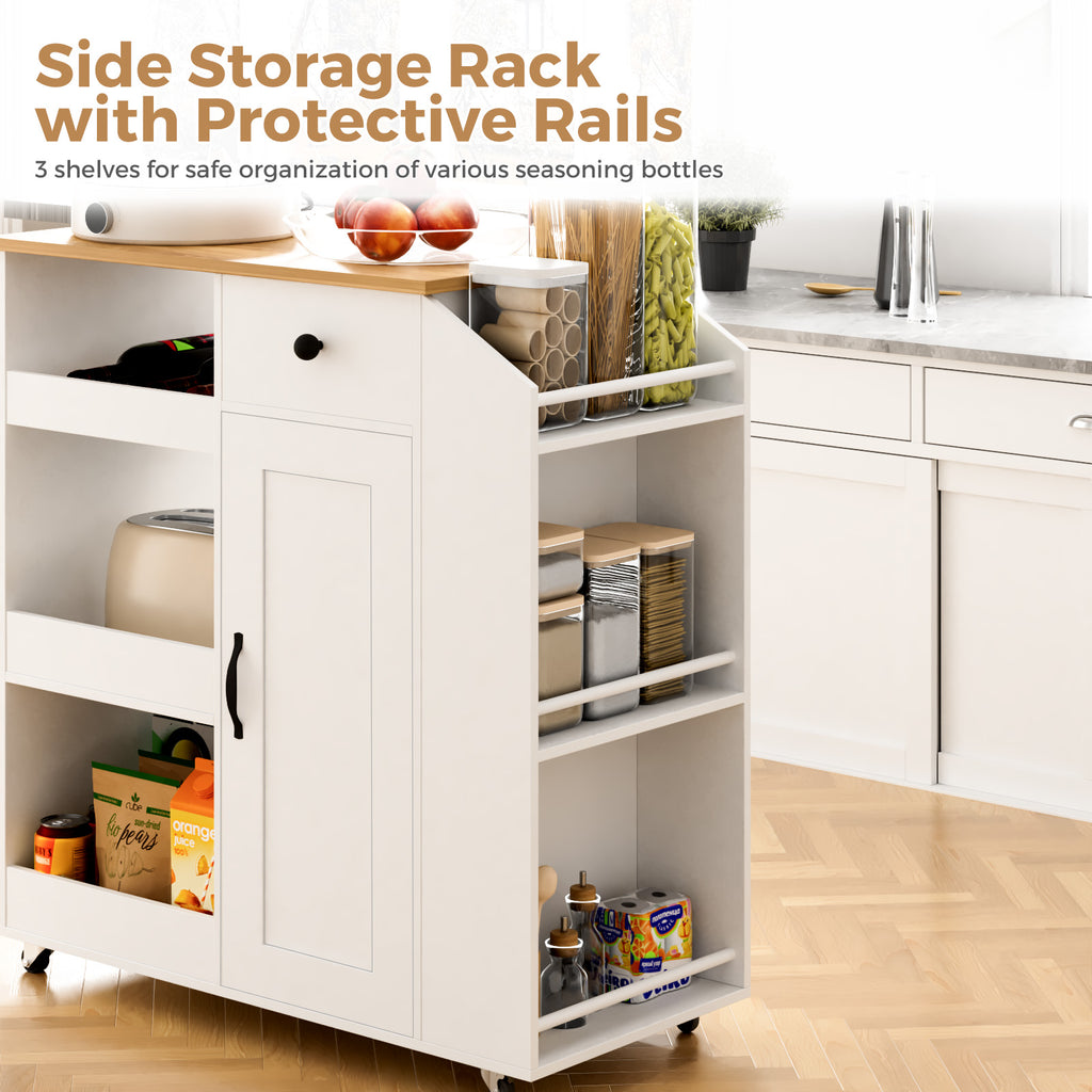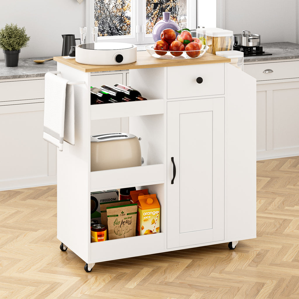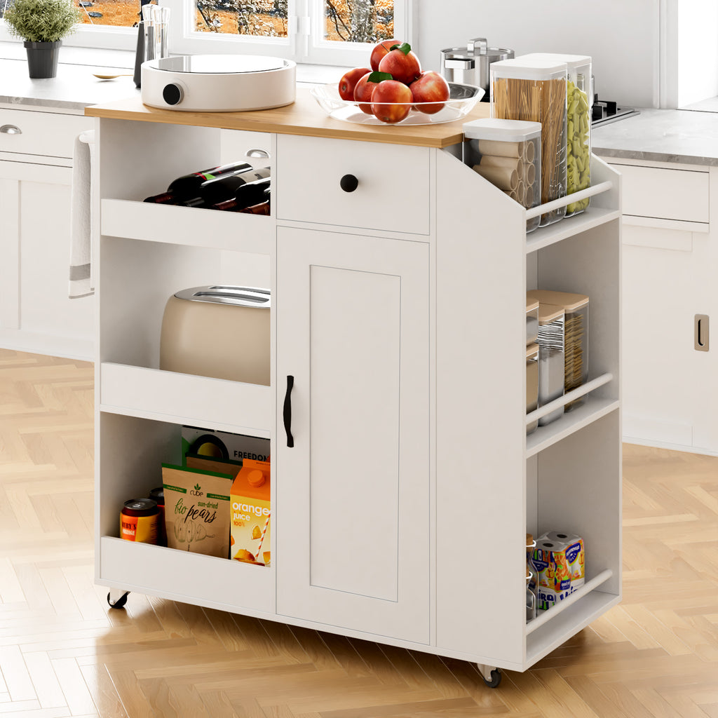Crafted for modern living, this multifunctional kitchen island trolley combines superior charging functionality with 2 AC outlets and 2 USB ports, it supports all your kitchen appliances. The practical storage includes two open shelves, a dedicated wine rack, a smooth drawer, a triple-tier spice rack, a towel holder, and three height-adjustable shelves inside the cabinet, offering a place for every kitchen essential. Finished in soft white and natural wood tone, this kitchen island adds timeless elegance to any home style, delivering both warmth and functionality to your daily routine.