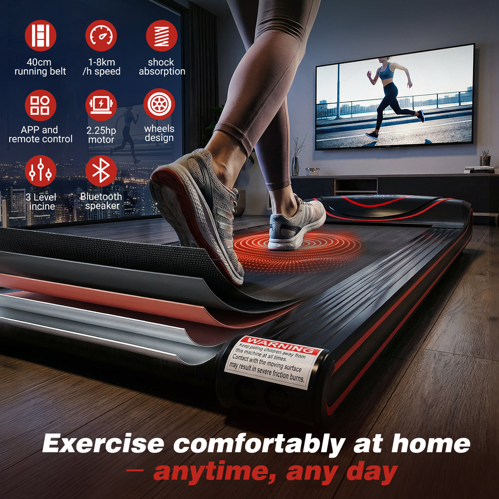 Easily control speed, incline, and workout modes using the included remote control or the Fitshow APP. This smart walking pad makes workouts more convenient, whether you are walking, jogging, or running.