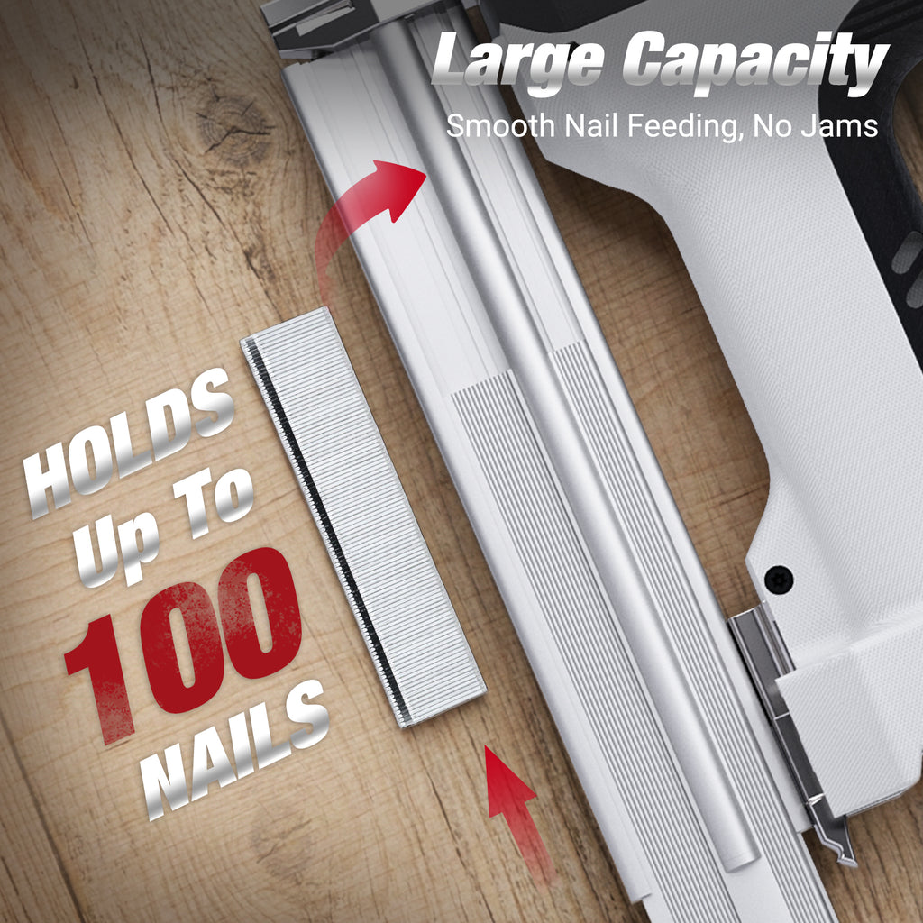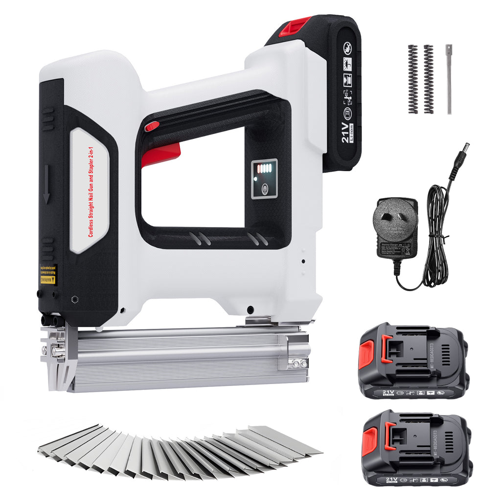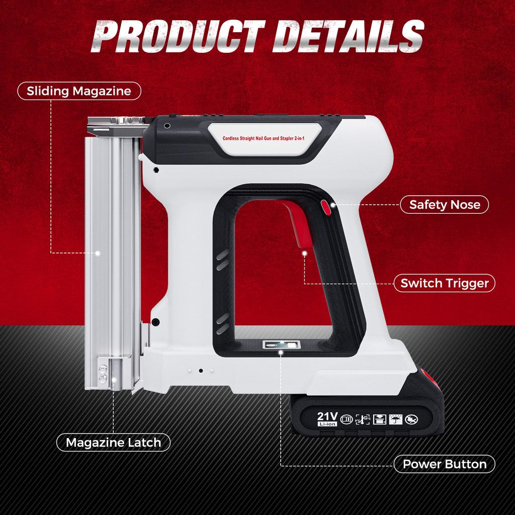 2-in-1 Brad nailer: The 2-in-1 nail gun is compatible with straight nails (25mm) and staples (16mm), each equipped with 1000PCS. The large capacity nail compartment reduces frequent nail installation time, making continuous operations more efficient without the need for frequent tool changes, meeting the needs of various scenarios such as decoration and woodworking.