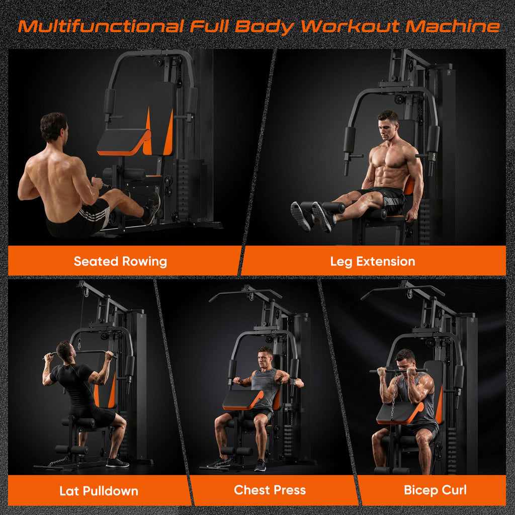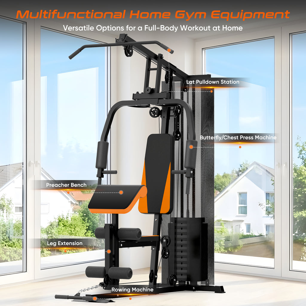 The Advwin Home Gym Station is an all-in-one strength training system for a full-body workout at home. Its heavy-duty steel frame provides stability and durability, while an ergonomic design with thickly padded seat and backrest ensures comfort during every exercise. This system includes a lat pulldown bar for back and shoulder workouts, dual-action arms for chest press and fly exercises, a preacher curl pad for arm curls, and a leg extension attachment for lower-body training. Together with the included straight curl bar and heavy-duty cables, these components let you perform dozens of exercises (presses, curls, extensions, pulldowns, etc.) targeting all major muscle groups. The adjustable 45kg weight stack (9 × 5kg plates) provides smooth, progressive resistance to match your strength level.