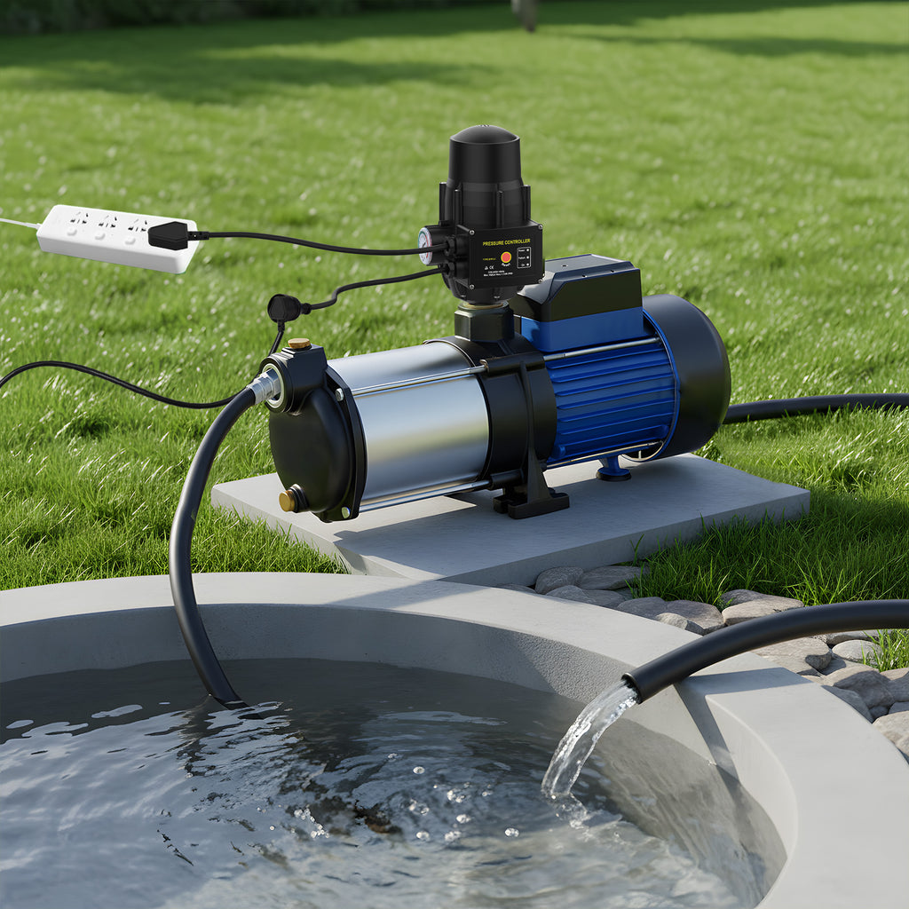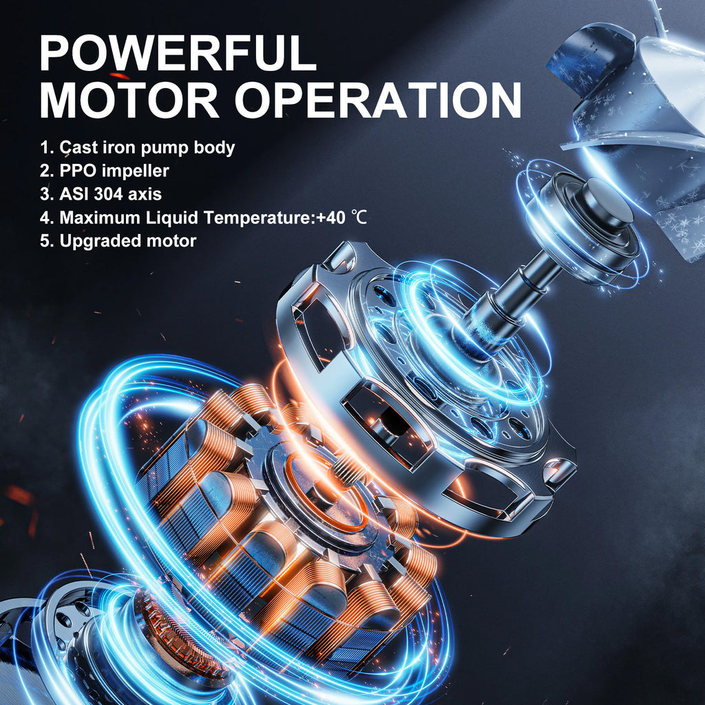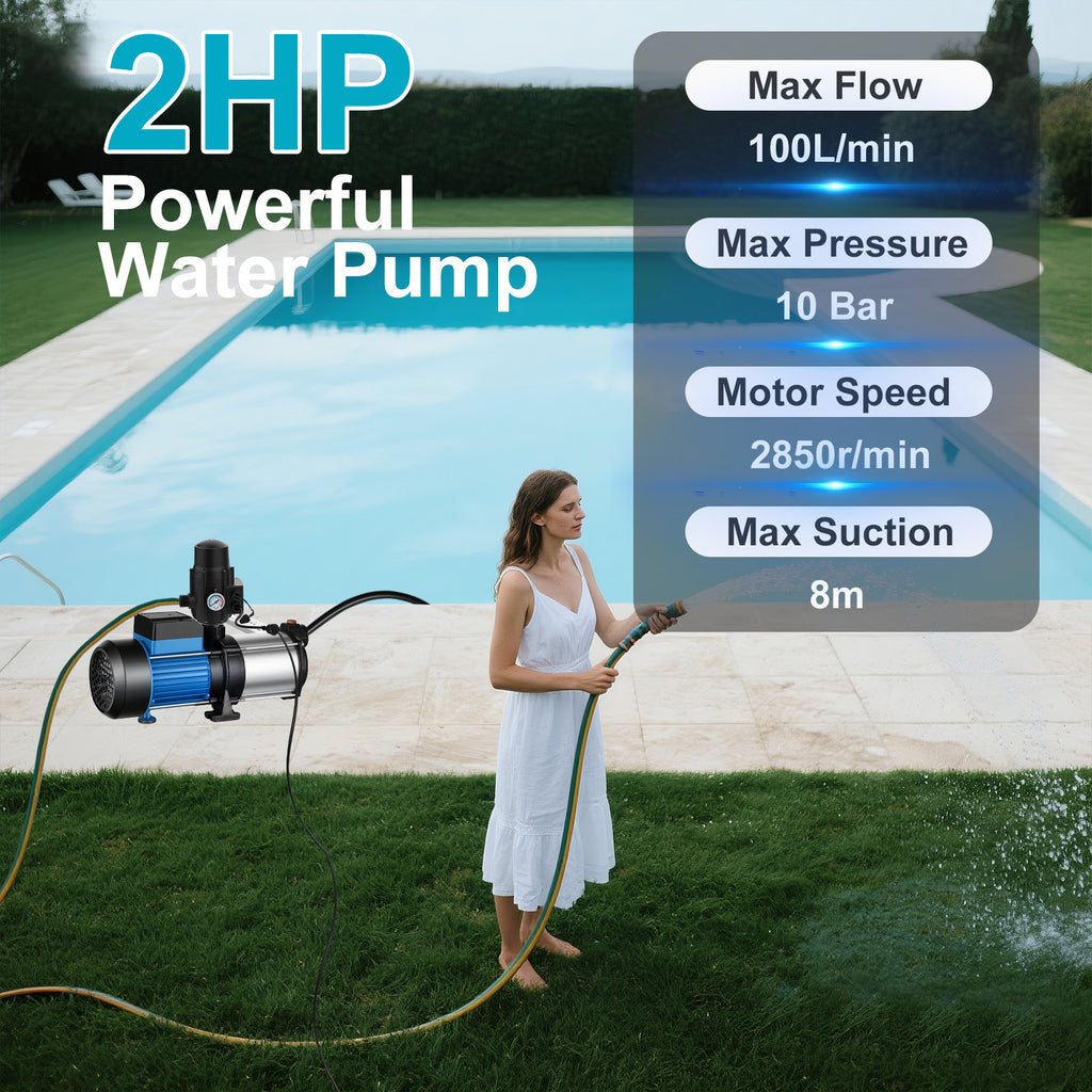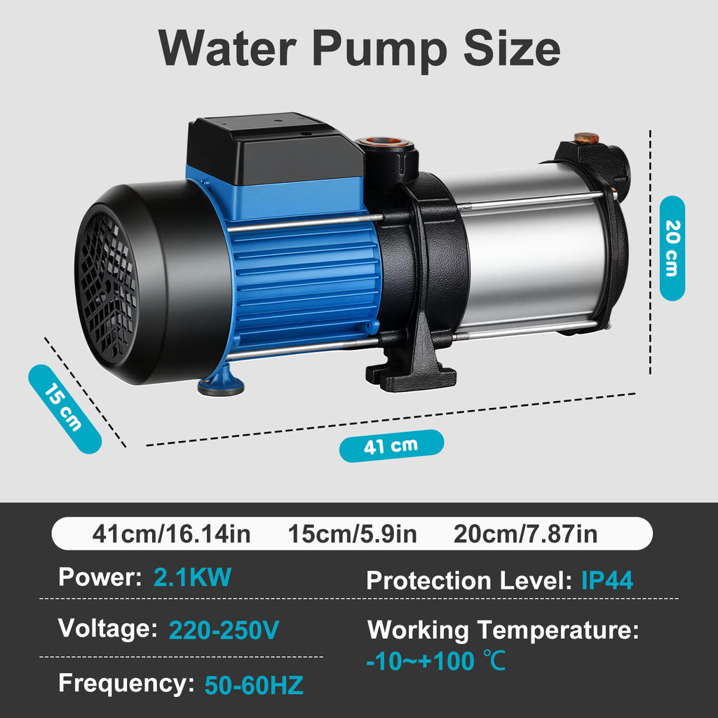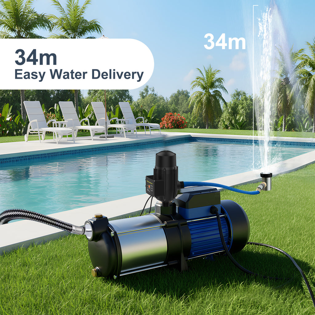- Powerful Performance: This garden water pump is equipped with a powerful 2HP copper wire motor, which can provide a maximum flow rate of 100L/min and a maximum head of 34 meters. Jet pumps can increase household water pressure through electronic controllers to ensure automatic operation and prevent dry running.