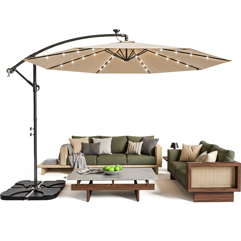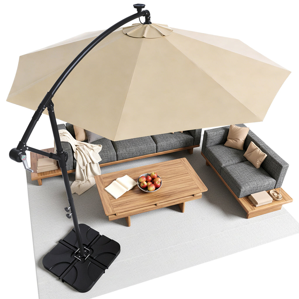 Our 3m solar patio umbrella - creates a spacious, shaded haven for every outdoor occasion. Whether you’re unwinding with family on the backyard patio, hosting lively BBQs in the garden, lounging by the pool, or setting up a cozy spot at the beach, this hanging cantilever umbrella delivers reliable sun protection and ambient lighting.