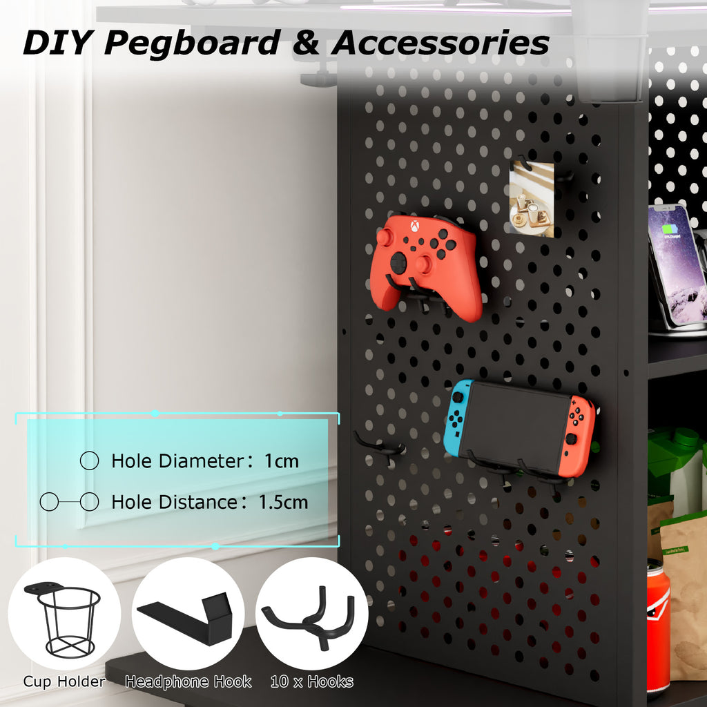 Introducing the ultimate gaming and productivity hub: rolling computer desk equipped with LED lighting, power outlets and 2 pegboards. This versatile desk seamlessly blends modern aesthetics with practical functionality.