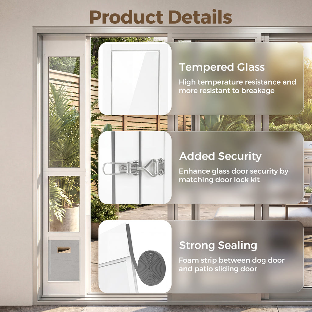 - Durable Aluminum Frame: Built with robust aluminum construction, this doggie door withstands daily use and weather elements. Sleek design blends with your décor while maintaining full sliding door functionality.