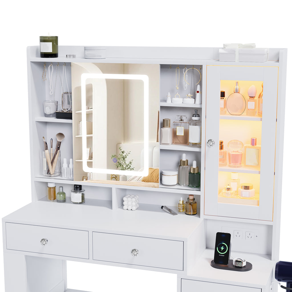 - RGB Lighting Cabinets: This dressing table features smart RGB LED light strip inside the glass cabinet, controllable via button or APP. The lights offer 60,000 colors, multiple lighting effects, and dynamic modes with music-sync function. You can easily customize the color, brightness, and mode through APP to create your ideal atmosphere and enjoy an immersive visual experience.