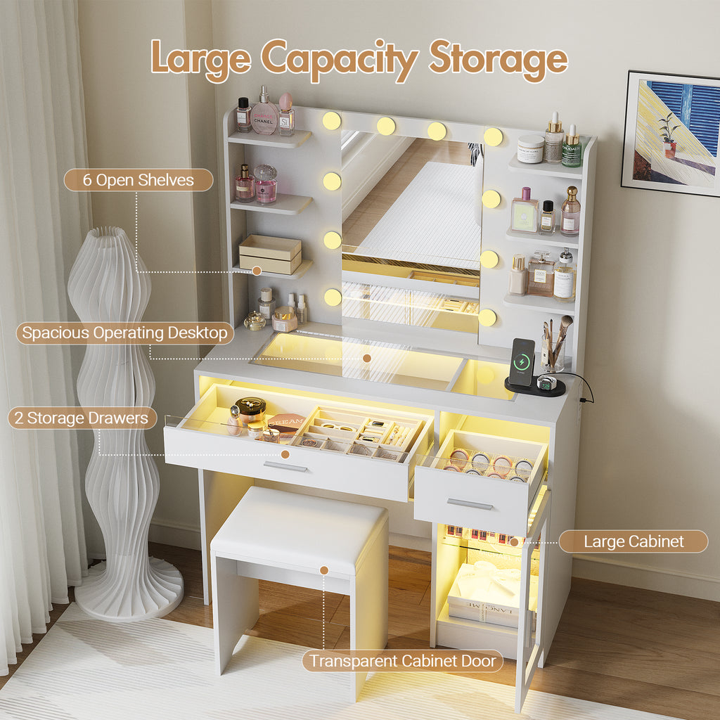• Exceptional Storage Capacity: This vanity table is designed for organization. It includes 6 open shelves, 2 smooth-gliding storage drawers, and a side cabinet with a transparent door, offering ample space for all your cosmetics, skincare products, accessories, and more, keeping everything tidy and within reach.