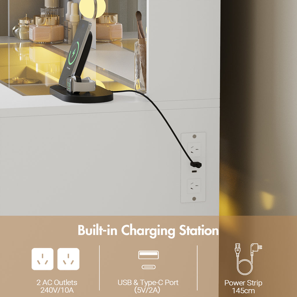• Integrated Charging Station & LED Light: This vanity features a built-in charging station with 2 AC sockets, 1 USB, and 1 Type-C port. Customise your space with LED light strips offering 60,000 colors, easily controlled via a button or a handy app for the perfect ambience.
